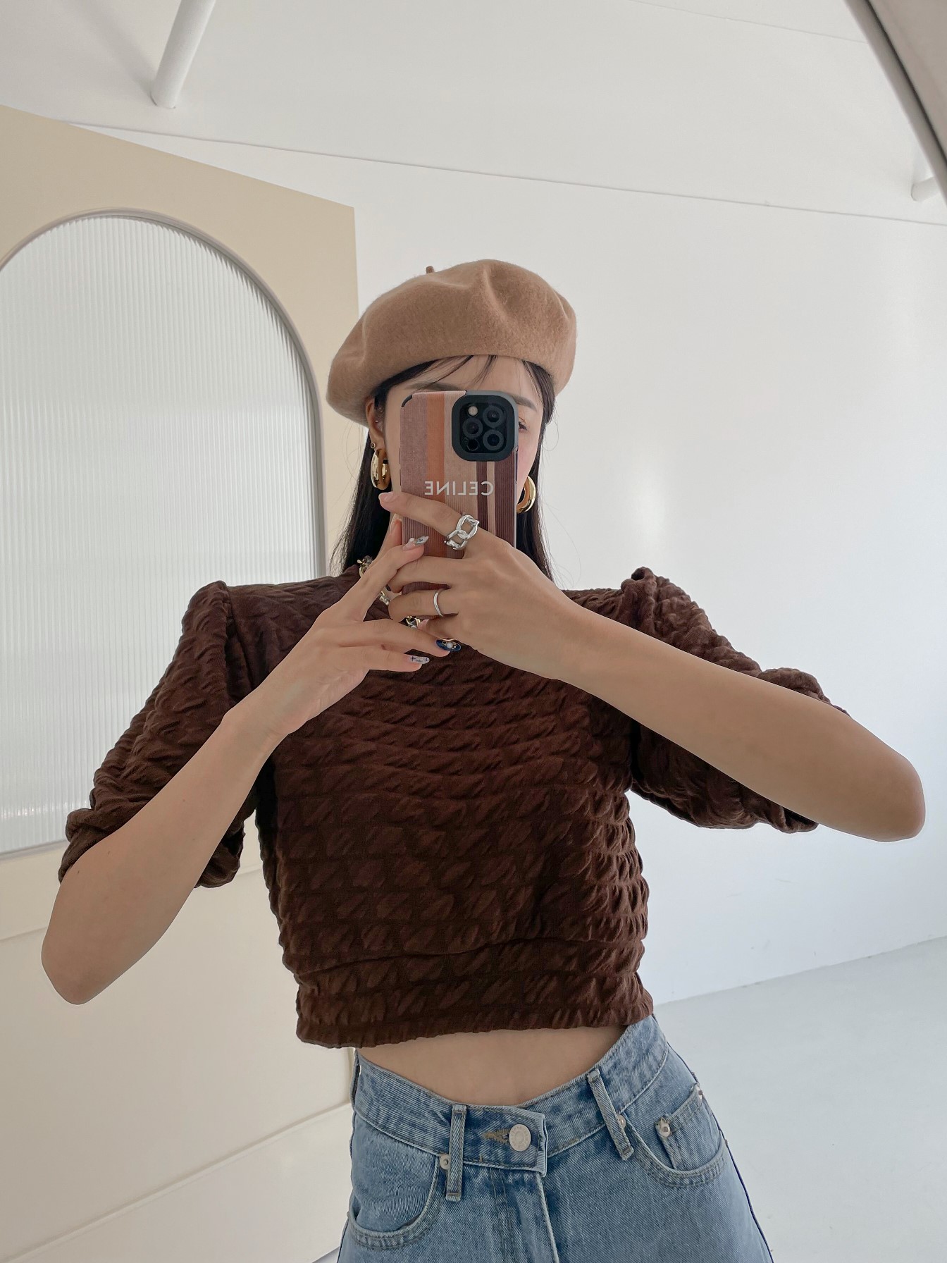 品名:볼륨티 ( 엠보싱 크롭 반팔 퍼프 crop ◎※☞颜色:브라운, 블랙, 블루, 아이보리 ◎※☞尺寸:FREE ◎※☞材质:스판 5%,聚酯 95% ◎※☞注意事项:只能干洗,只能手洗,不能手洗,机洗,不能使用漂白剂,不能烘干,不能熨烫,不能曲折