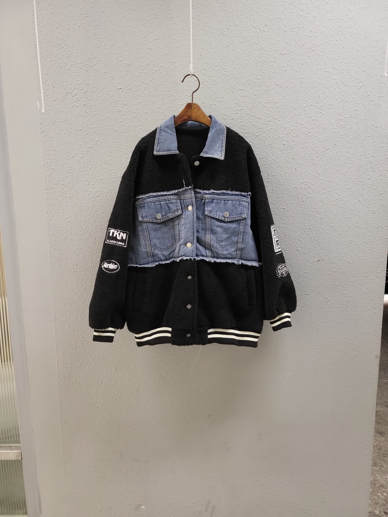 品名:시보리 데님 배색 플리스 무스탕 자켓 ◎※☞颜色:블랙 ◎※☞尺寸:FREE ◎※☞材质:纯棉 50%,聚酯 50% ◎※☞注意事项:只能干洗,只能手洗,不能手洗,机洗,不能使用漂白剂,不能烘干,不能熨烫,不能曲折
