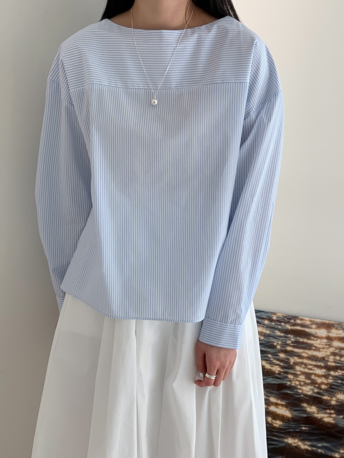 品名:23년 SS 봄신상#) 보트넥 스트라이프 블라우스 ◎※☞颜色:베이지, 소라 ◎※☞尺寸:FREE ◎※☞材质:纯棉 100% ◎※☞注意事项:只能干洗,只能手洗,不能手洗,机洗,不能使用漂白剂,不能烘干,不能熨烫,不能曲折