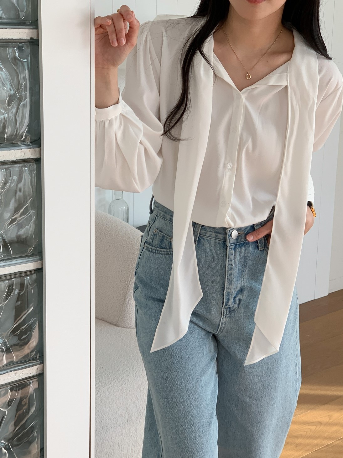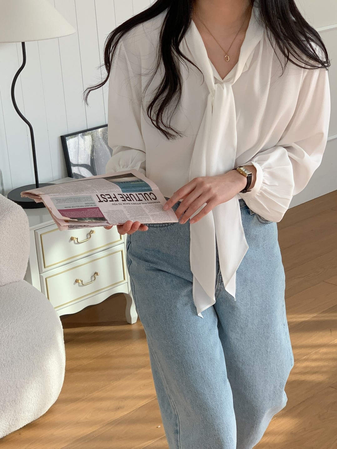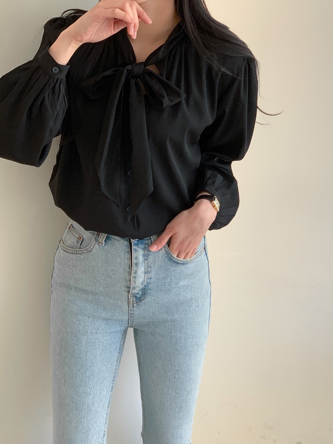品名:23년 SS 봄신상#) 바네 셔링 타이 블라우스 ◎※☞颜色:블랙, 아이보리 ◎※☞尺寸:FREE ◎※☞材质:聚酯 100% ◎※☞注意事项:只能干洗,只能手洗,不能手洗,机洗,不能使用漂白剂,不能烘干,不能熨烫,不能曲折