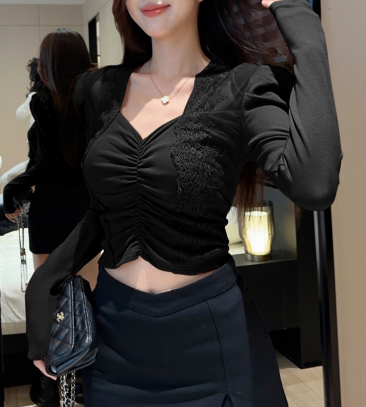 品名:셔링레이스블라우스 #여성상의캐주얼시크섹시로맨틱가을겨울 ◎※☞颜色:블랙, 빨강, 화이트 ◎※☞尺寸:FREE ◎※☞材质:纯棉 100%