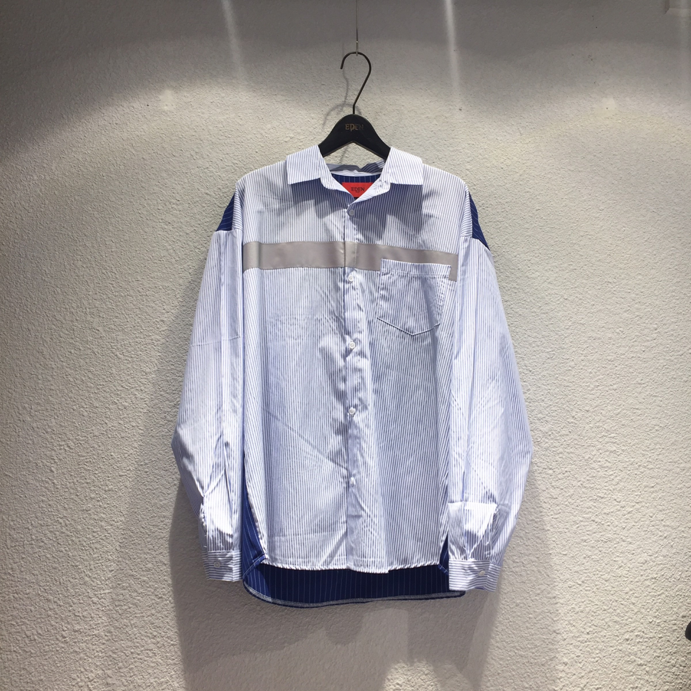 면폴리 혼방의 스트라이프셔츠입니다. 세미오버핏에 배색과 3M reflective line이 들어간 셔츠입니다.
