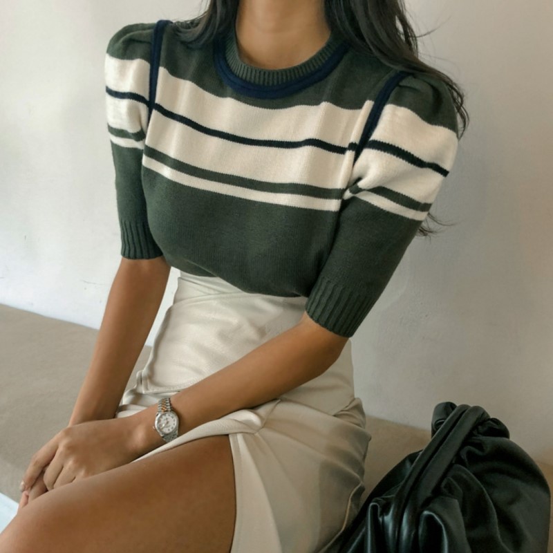 "THANK YOU(O)"-OT-4H-21- 圆领短袖条纹针织衫/开衫 翻译