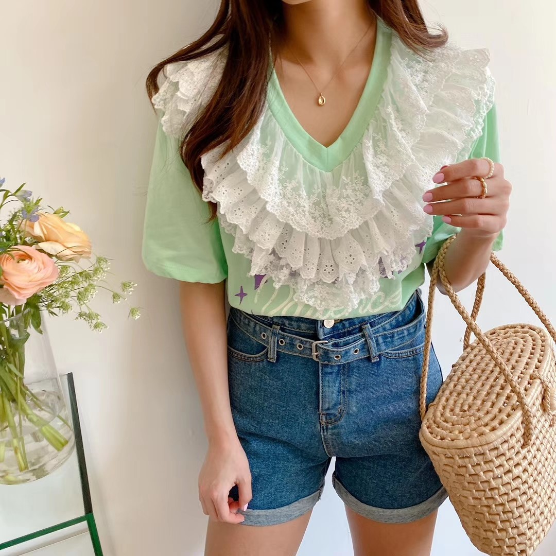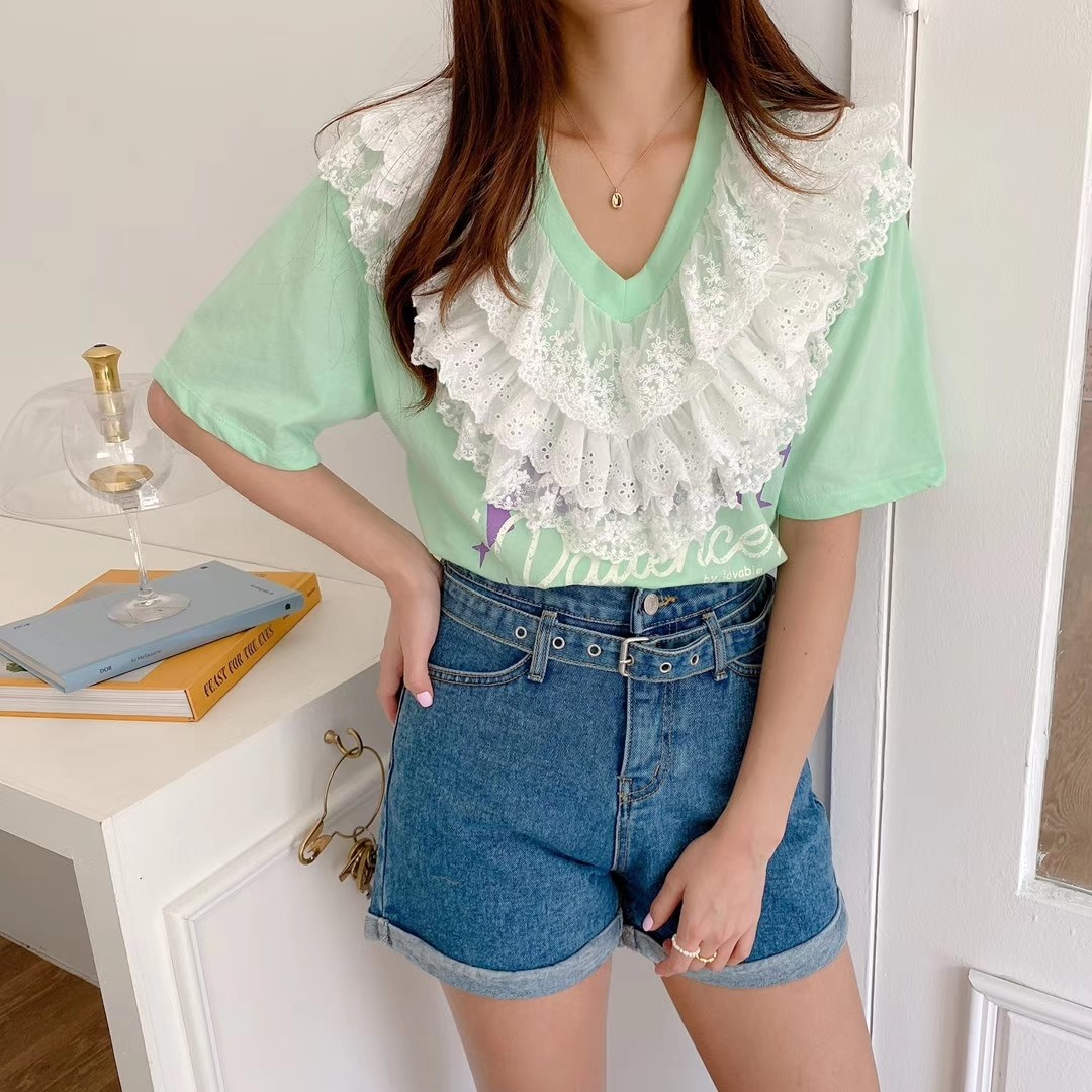 图款 新款女士蕾丝边T恤,上身时尚大气有气质,上街回头率超高,韩国爆款款式,喜欢不要错过哦!