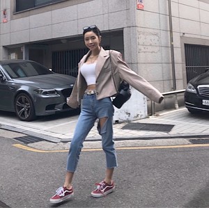 앞뒤로 찢어져있어 유니크하고 크롭한기장의 연청컬러의 청바지입니다 翻译