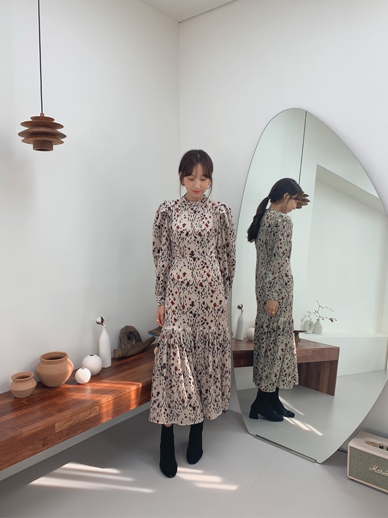 플라워패턴의 반하이넥 롱원피스입니다.