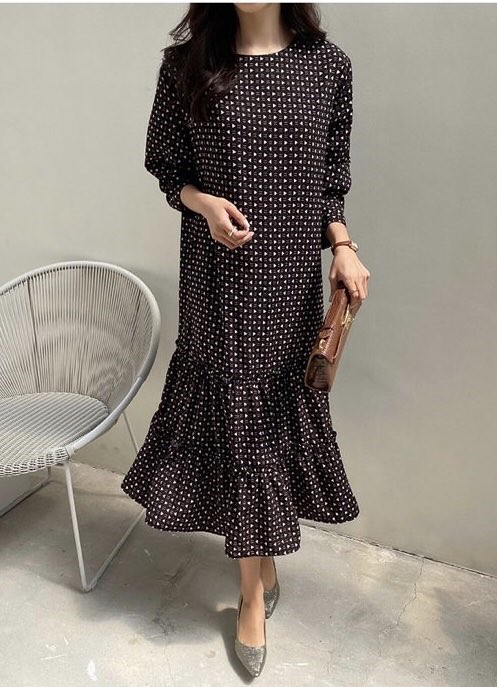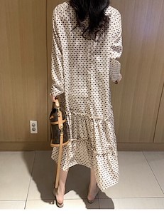 유니크하고 이쁜 나염패턴의 여성스러운 무드를 연출하는 롱~원피스 하늘하늘 거리는 소재로 밑단이 프릴 디테일로 은은하게 더해줘 움직일때 실루엣이 여성스러우며 여유있는 핏으로 여리여리한 느낌~ 나염패턴의 루피원피스