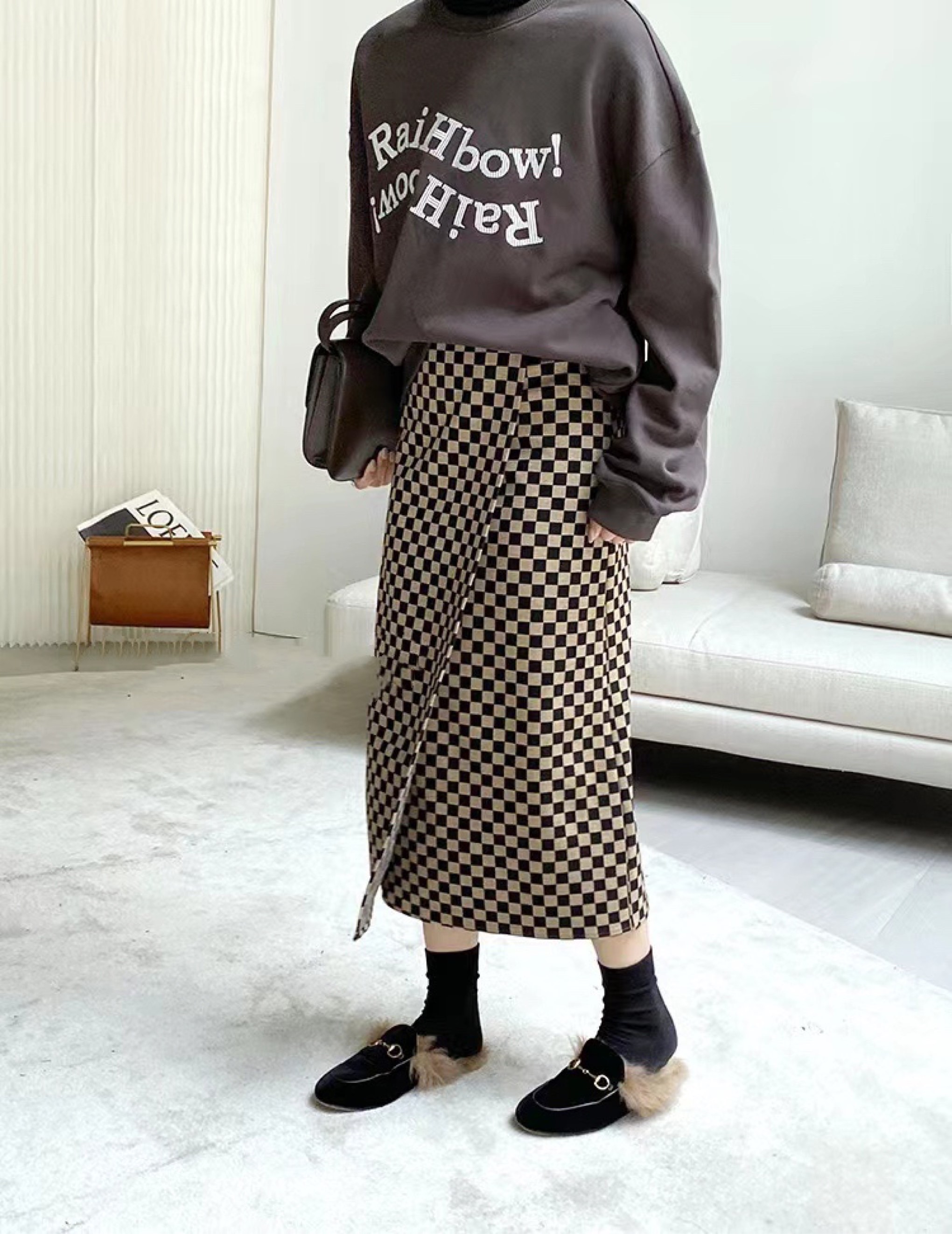 格子长款半身裙子