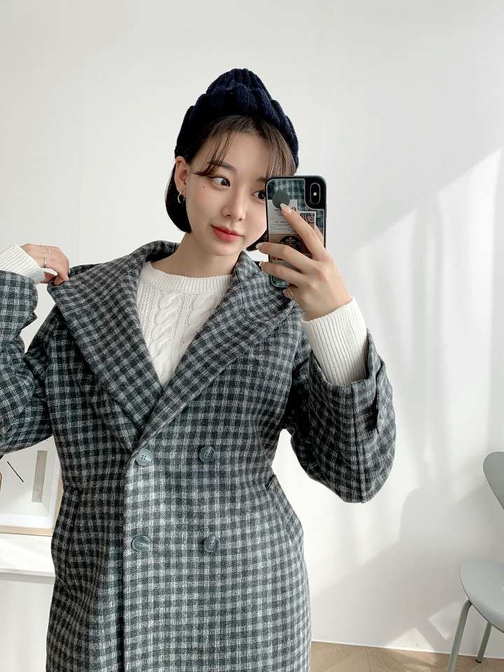 체크후드 울 더블 코트-handmade