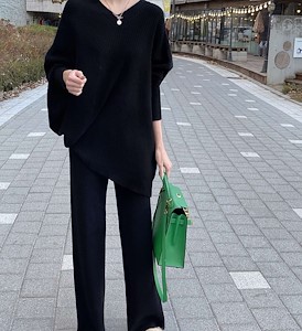 루즈핏 브이넥 언발 골지 니트 투피스 set