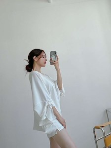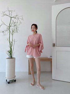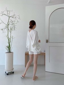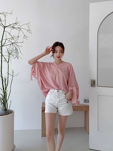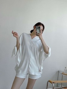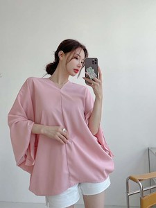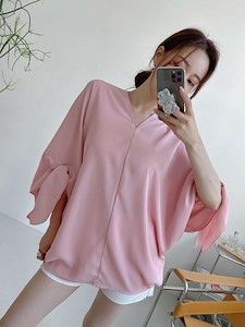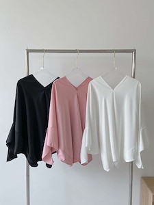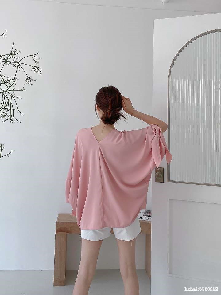 고급스러운 실크 느낌의 원단으로~ 가오리 박시 오버핏 스타일로 어깨선부터 소매까지 따로 구분없이 소매쪽을 묶어서 연출하는 앞뒤 브이넥 유니크한 블라우스~ 하늘하늘 떨어지는 스타일과 소매를 묶지 않고 다른 스타일 연출가능~