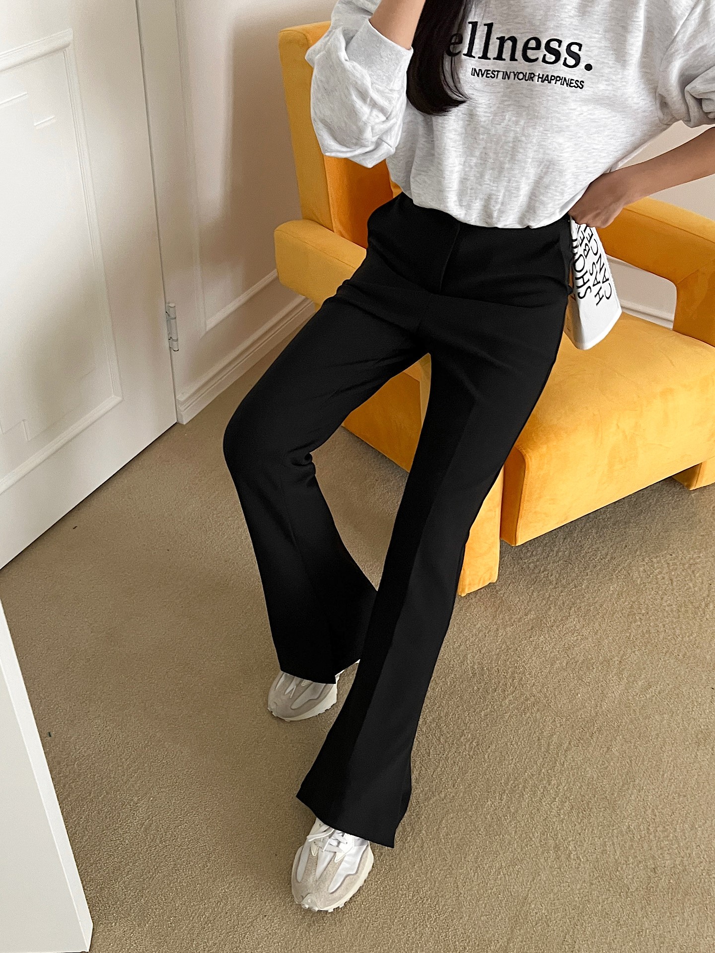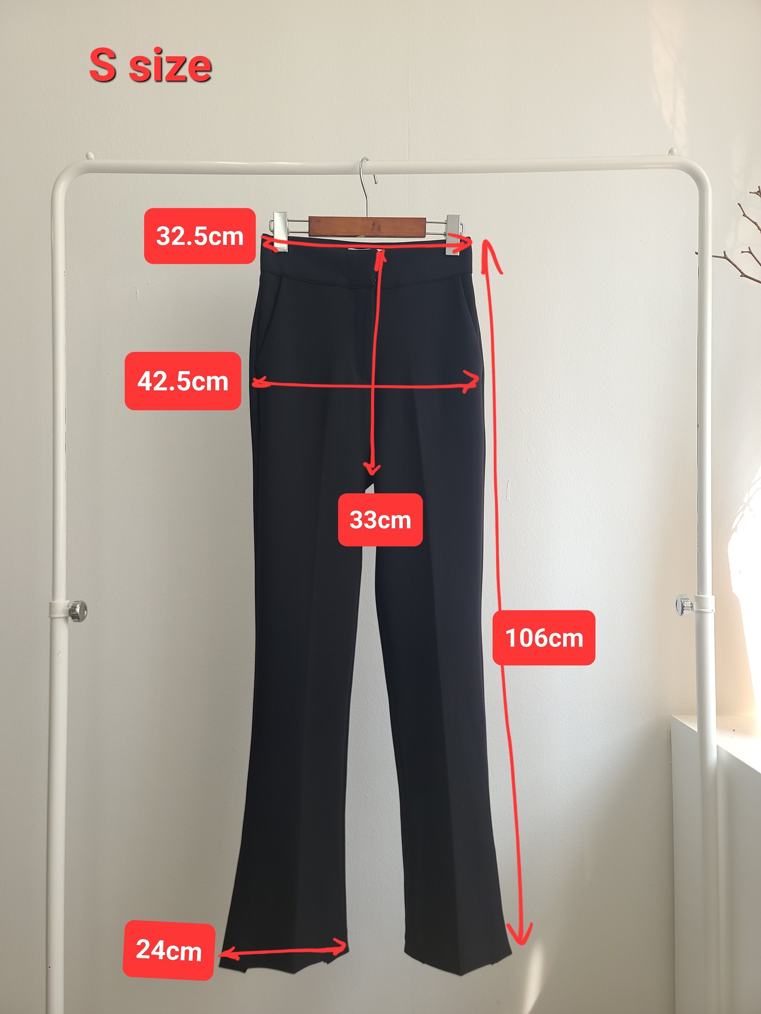 品名:슬림 슬랙스 ( 세미 나팔 스판 하이웨스트 슬렉스 ◎※☞颜色:블랙 ◎※☞尺寸:M, S ◎※☞材质:스판 8%,聚酯 92% ◎※☞注意事项:只能干洗,只能手洗,不能手洗,机洗,不能使用漂白剂,不能烘干,不能熨烫,不能曲折