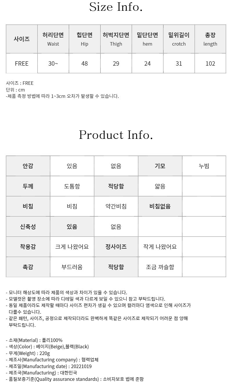 品名:타미팬츠 ◎※☞颜色:베이지, 블랙 ◎※☞尺寸:FREE ◎※☞材质:聚酯 100% ◎※☞注意事项:只能干洗,只能手洗,不能手洗,机洗,不能使用漂白剂,不能烘干,不能熨烫,不能曲折 翻译