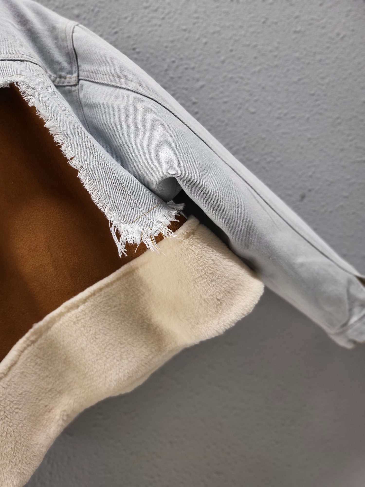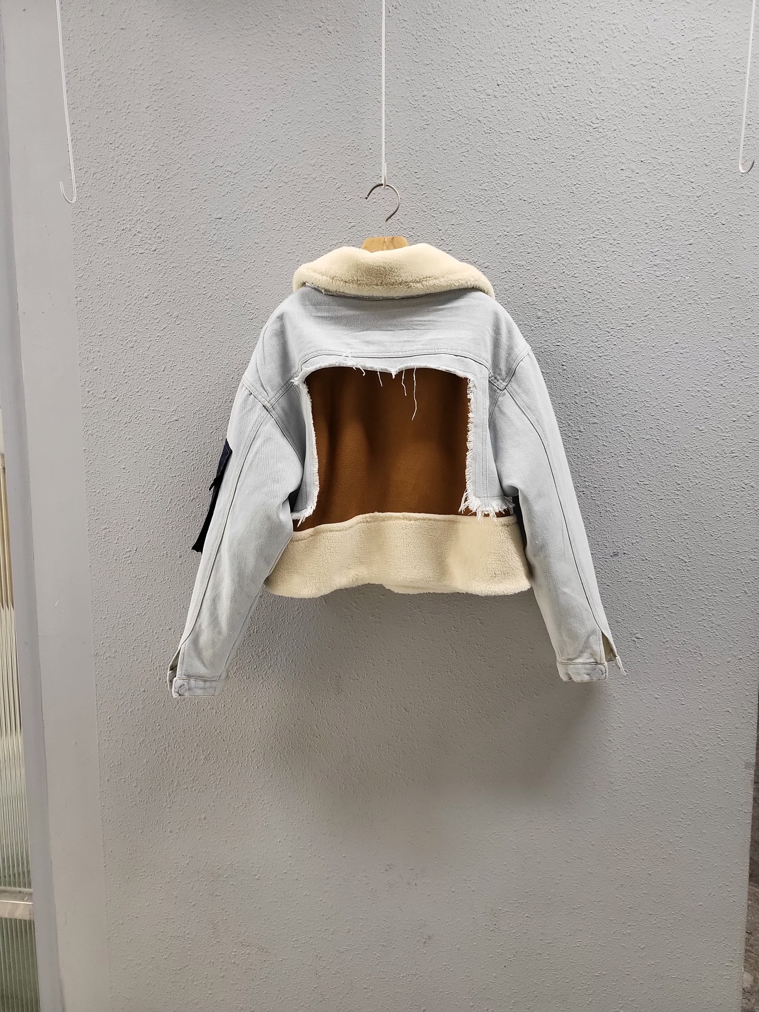 品名:유니크 커팅 데님 배색 털 코트 ◎※☞颜色:아이보리 ◎※☞尺寸:FREE ◎※☞材质:腈纶 50%,聚酯 50% 翻译