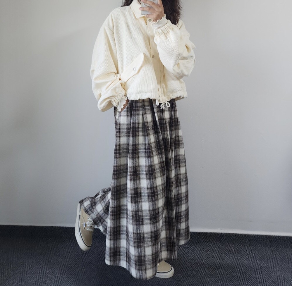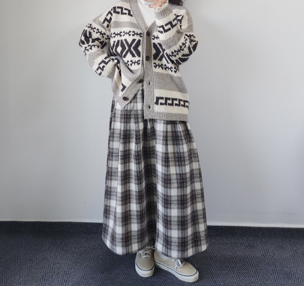 品名:체키 체크 롱 SK ◎※☞颜色:베이지, 블랙 ◎※☞尺寸:FREE ◎※☞材质:羊毛 10%,聚酯 90% 翻译