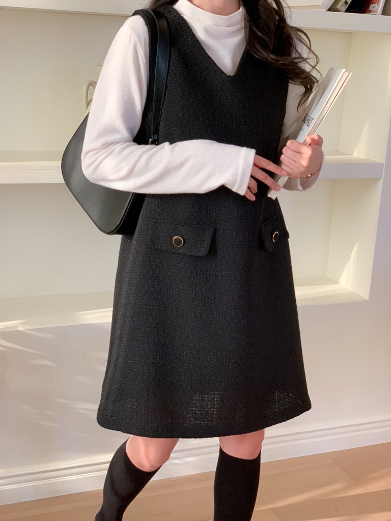 品名:简约v领小香风宽松背心连衣裙 ◎※☞颜色:블랙, 아이보리 ◎※☞尺寸:FREE ◎※☞材质:聚酯 90%,纯棉 10% ◎※☞注意事项:只能干洗,只能手洗,不能手洗,机洗,不能使用漂白剂,不能烘干,不能熨烫,不能曲折