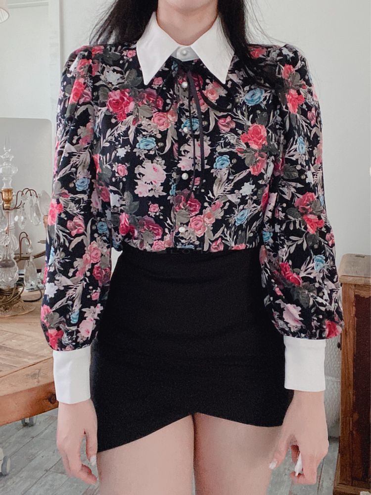 品名:로사 블라우스 - 플라워나염블라우스 리본배색블라우스 진주단추 ◎※☞颜色:베이지, 블랙, 연보라 ◎※☞尺寸:FREE ◎※☞材质:기타 100% 翻译