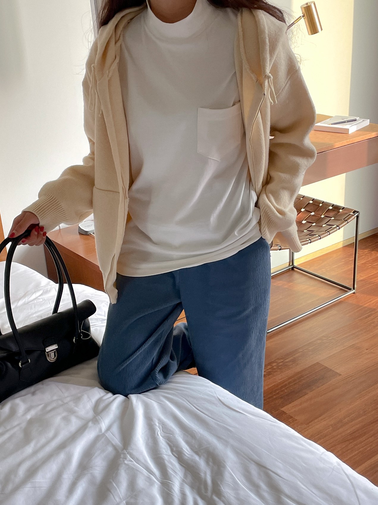 品名:피치포켓폴라T ◎※☞颜色:머스타드, 브라운, 블랙, 아이보리, 차콜 ◎※☞尺寸:FREE ◎※☞材质:纯棉 100% 翻译