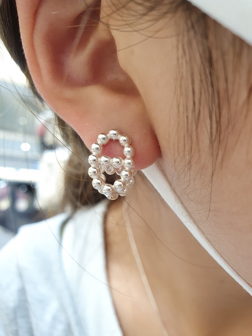 品名:은제품--양면 타원 반은볼 반큐빅 귀걸이
