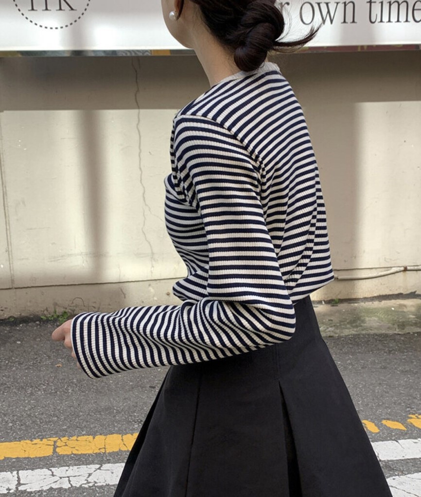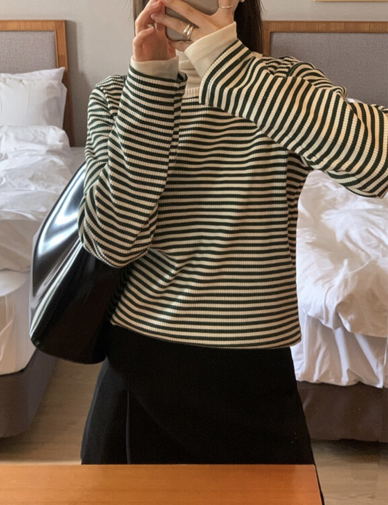 品名:단가라 삼각 골지티 /거래처 사진 ◎※☞颜色:그린, 네이비, 카멜 ◎※☞尺寸:FREE ◎※☞材质:纯棉 95%,스판 5% 翻译