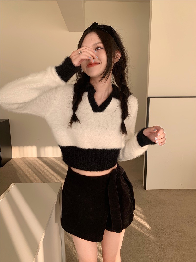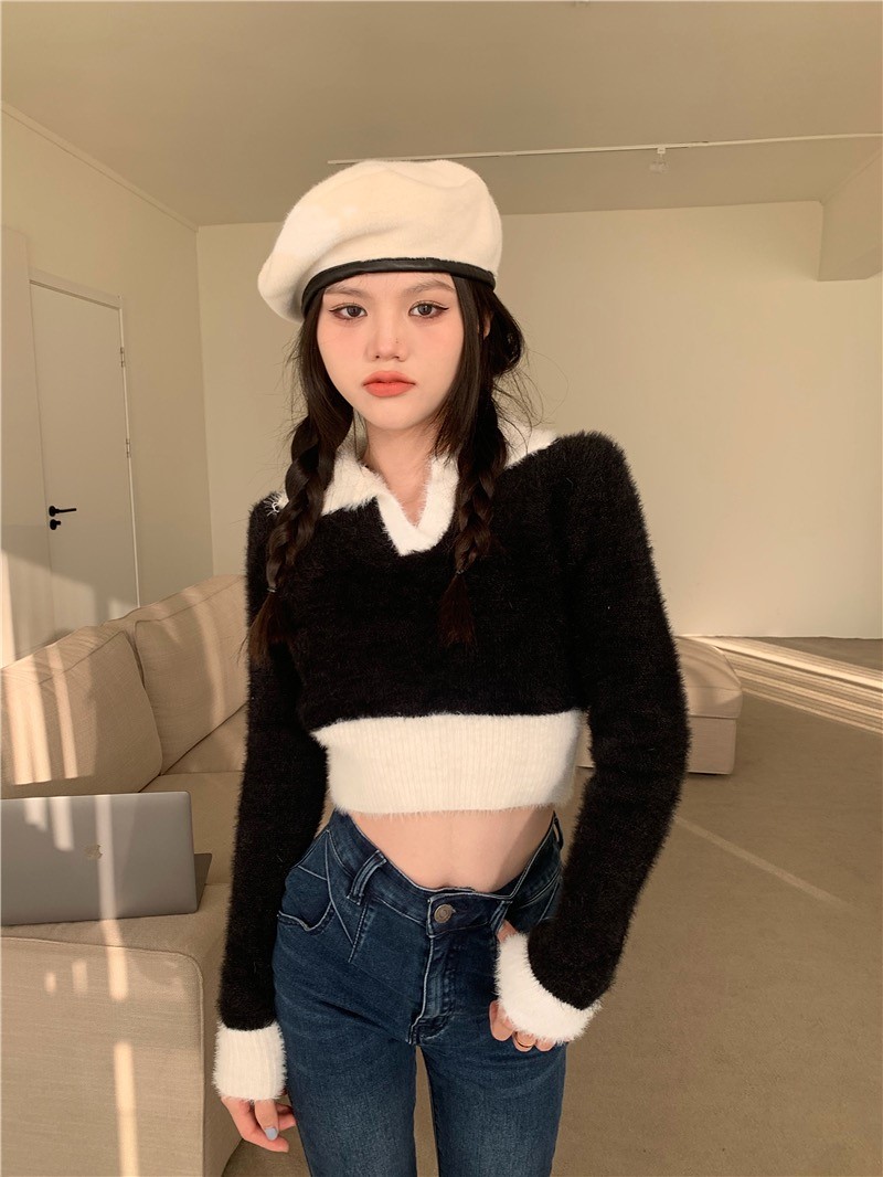 品名:배색카라니트 ◎※☞颜色:블랙, 소라, 핑크, 화이트 ◎※☞尺寸:FREE ◎※☞材质:纯棉 90%,聚酯 10% 翻译