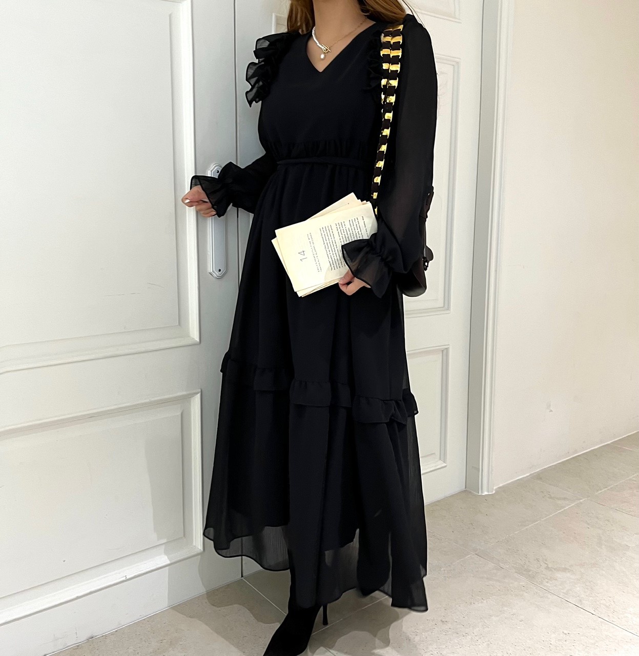 品名:요루프릴롱원피스 ◎※☞颜色:블랙, 화이트 ◎※☞尺寸:FREE ◎※☞材质:聚酯 100% 翻译