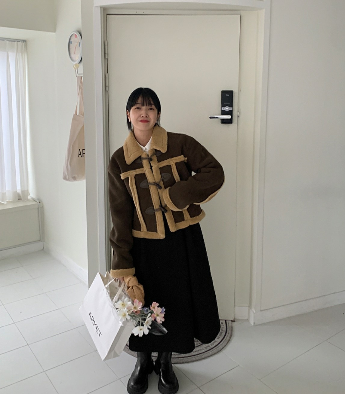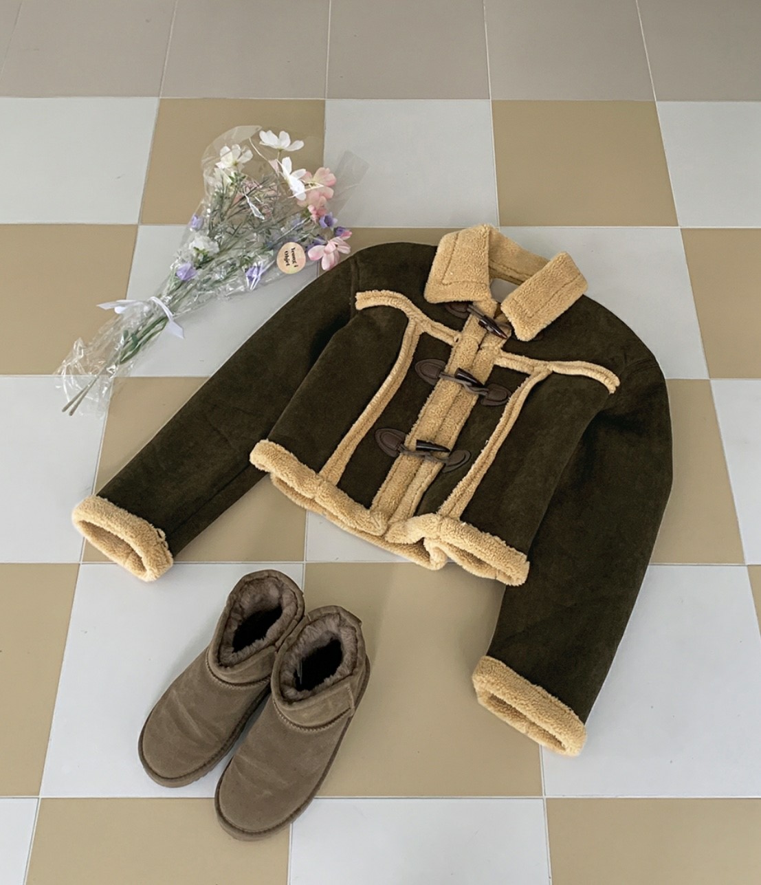 品名:트리덤블무스탕자켓 ◎※☞颜色:진브라운, 카멜, 카키브라운 ◎※☞尺寸:FREE ◎※☞材质:聚酯 100% 翻译