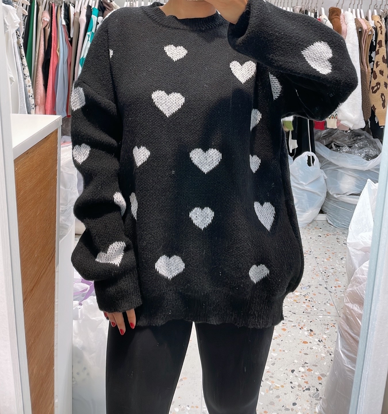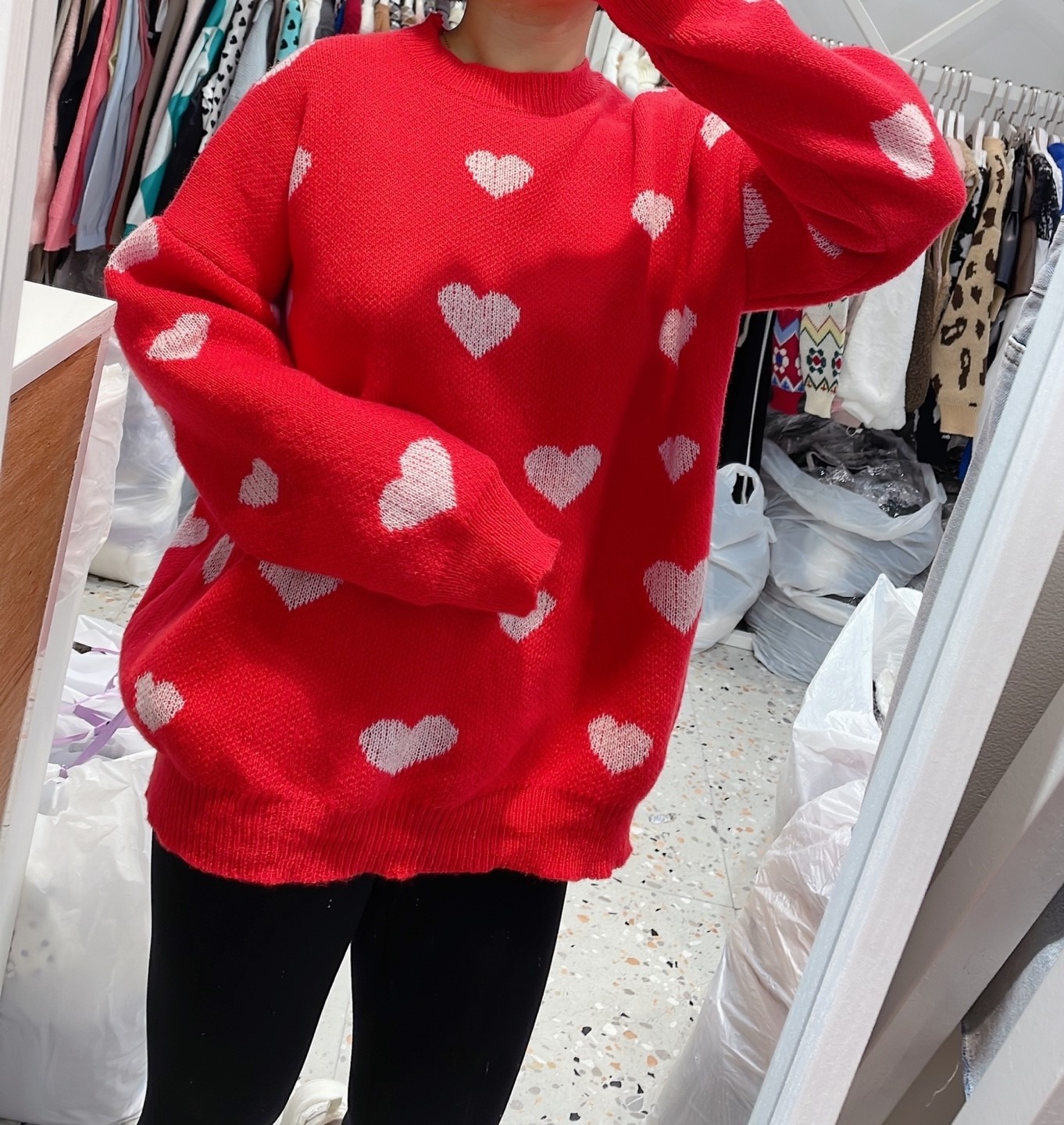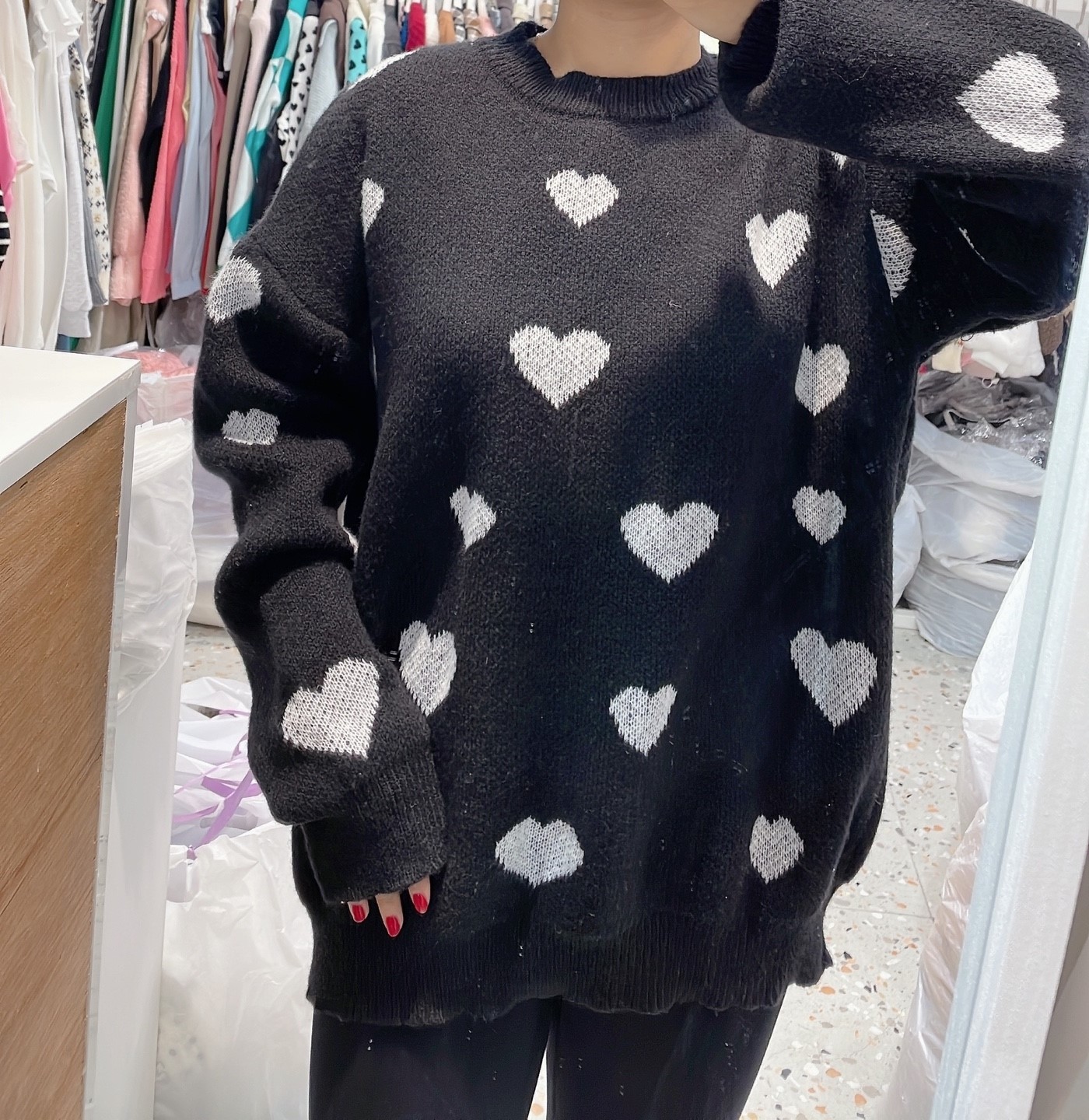 品名:하트니트 #여성상의캐주얼시크로맨틱크리스마스겨울라운드 ◎※☞颜色:레드, 블랙 ◎※☞尺寸:FREE ◎※☞材质:聚酯 100% 翻译