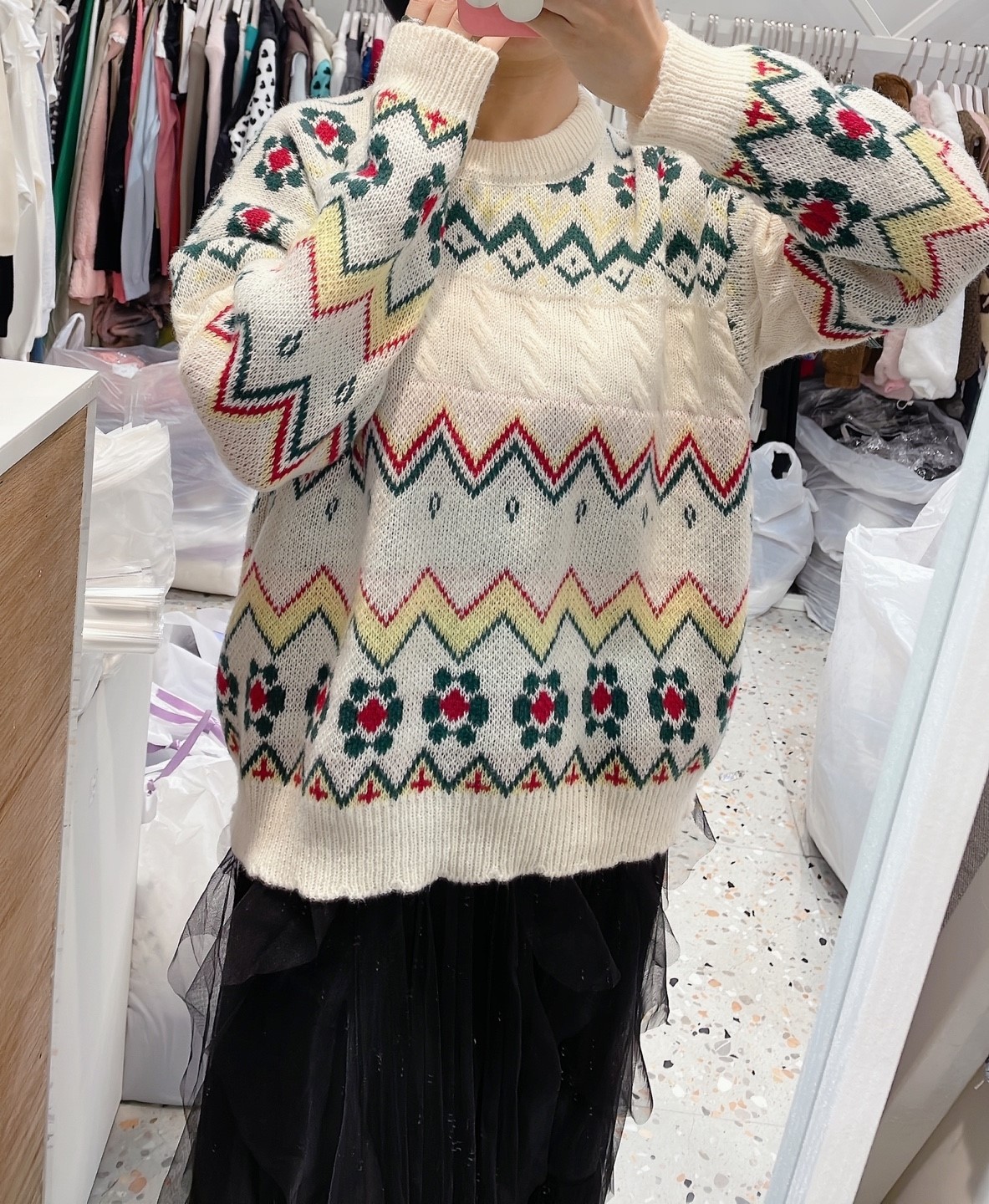 品名:플라워라운드니트 #여성상의캐주얼시크로맨틱겨울크리스마스 ◎※☞颜色:아이보리 ◎※☞尺寸:FREE ◎※☞材质:聚酯 100% 翻译