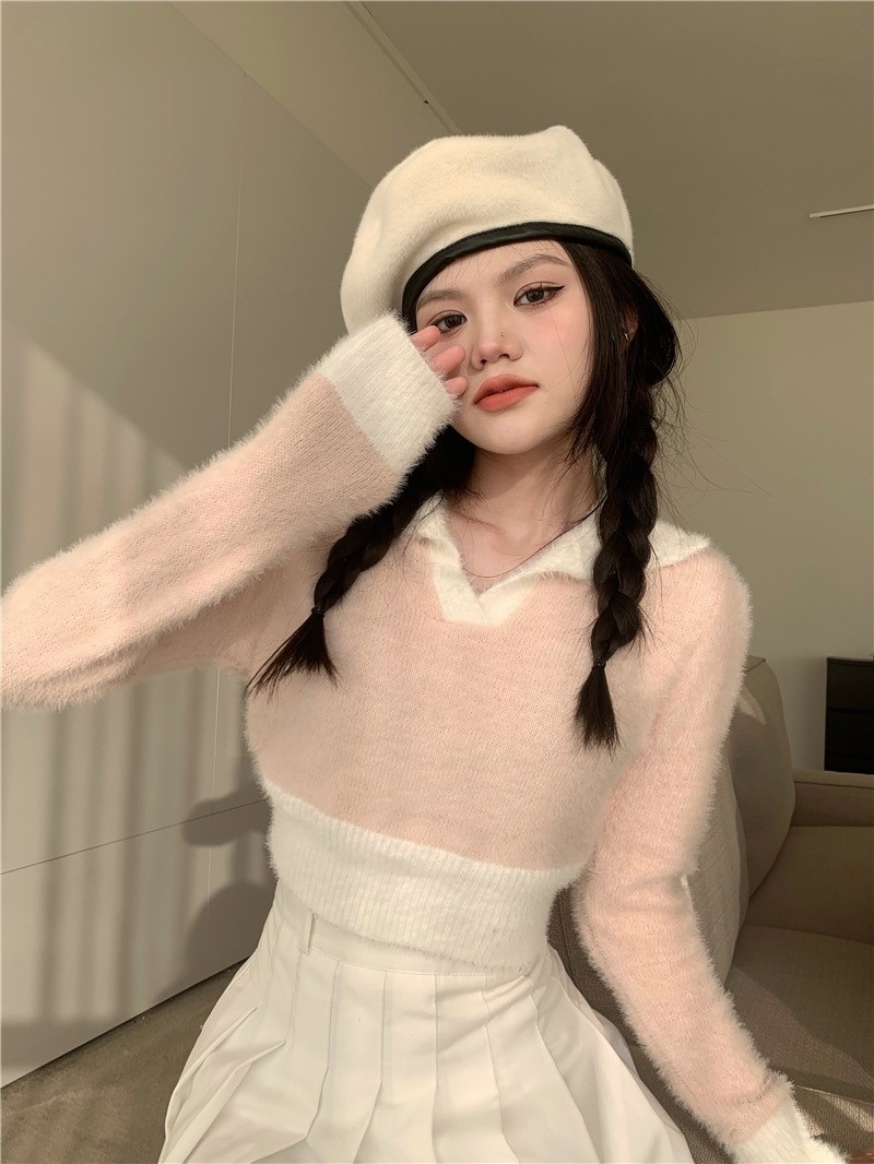 品名:배색카라니트 ◎※☞颜色:블랙, 소라, 핑크, 화이트 ◎※☞尺寸:FREE ◎※☞材质:纯棉 90%,聚酯 10% 翻译