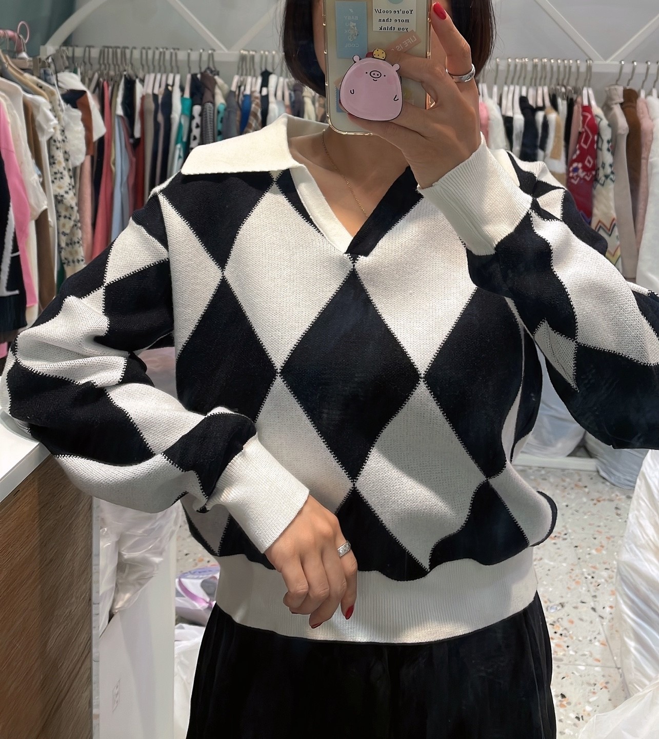 品名:배색아가일니트 #여성상의캐주얼시크섹시로맨틱겨울 ◎※☞颜色:민트, 블랙 ◎※☞尺寸:FREE ◎※☞材质:聚酯 100% 翻译