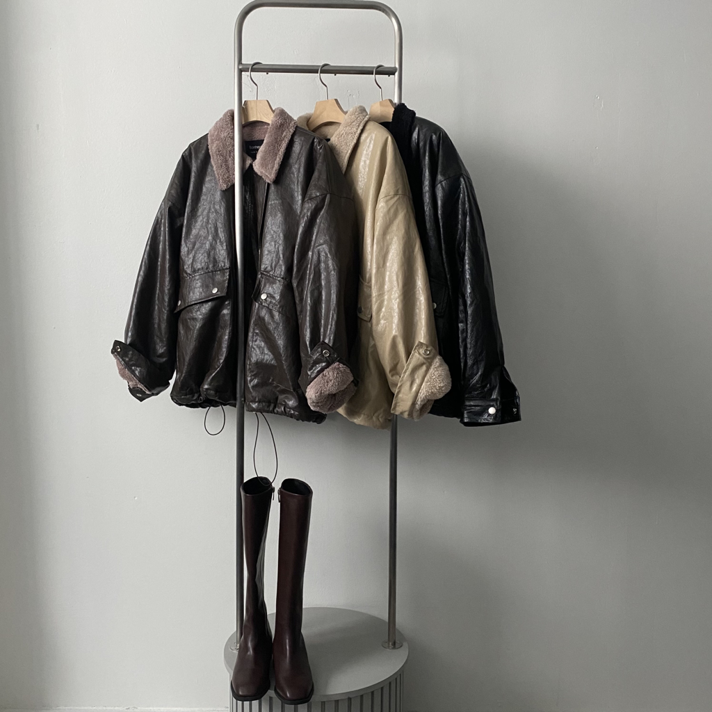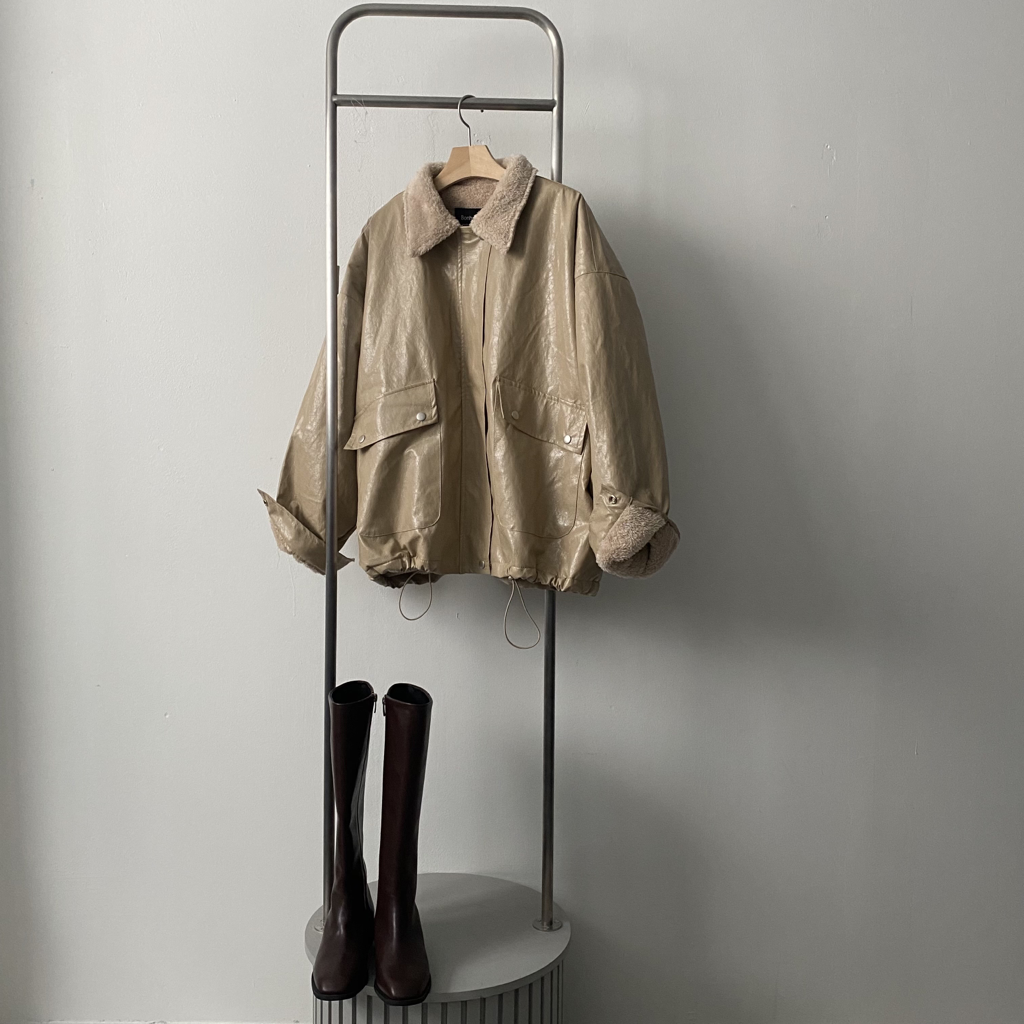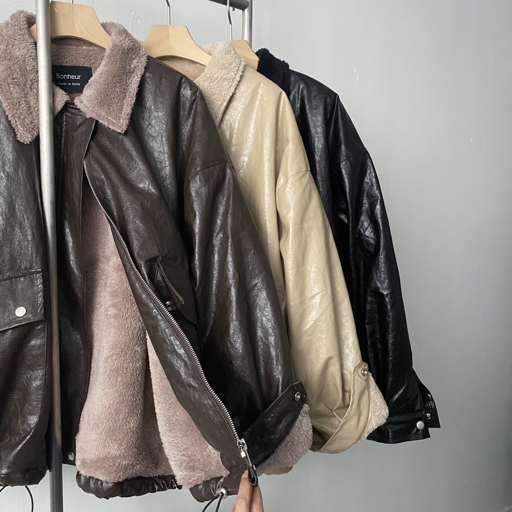 品名:时尚绒毛内衬宽松皮夹克外套 ◎※☞颜色:베이지, 브라운, 블랙 ◎※☞尺寸:FREE ◎※☞材质:聚氨酯 100% 翻译
