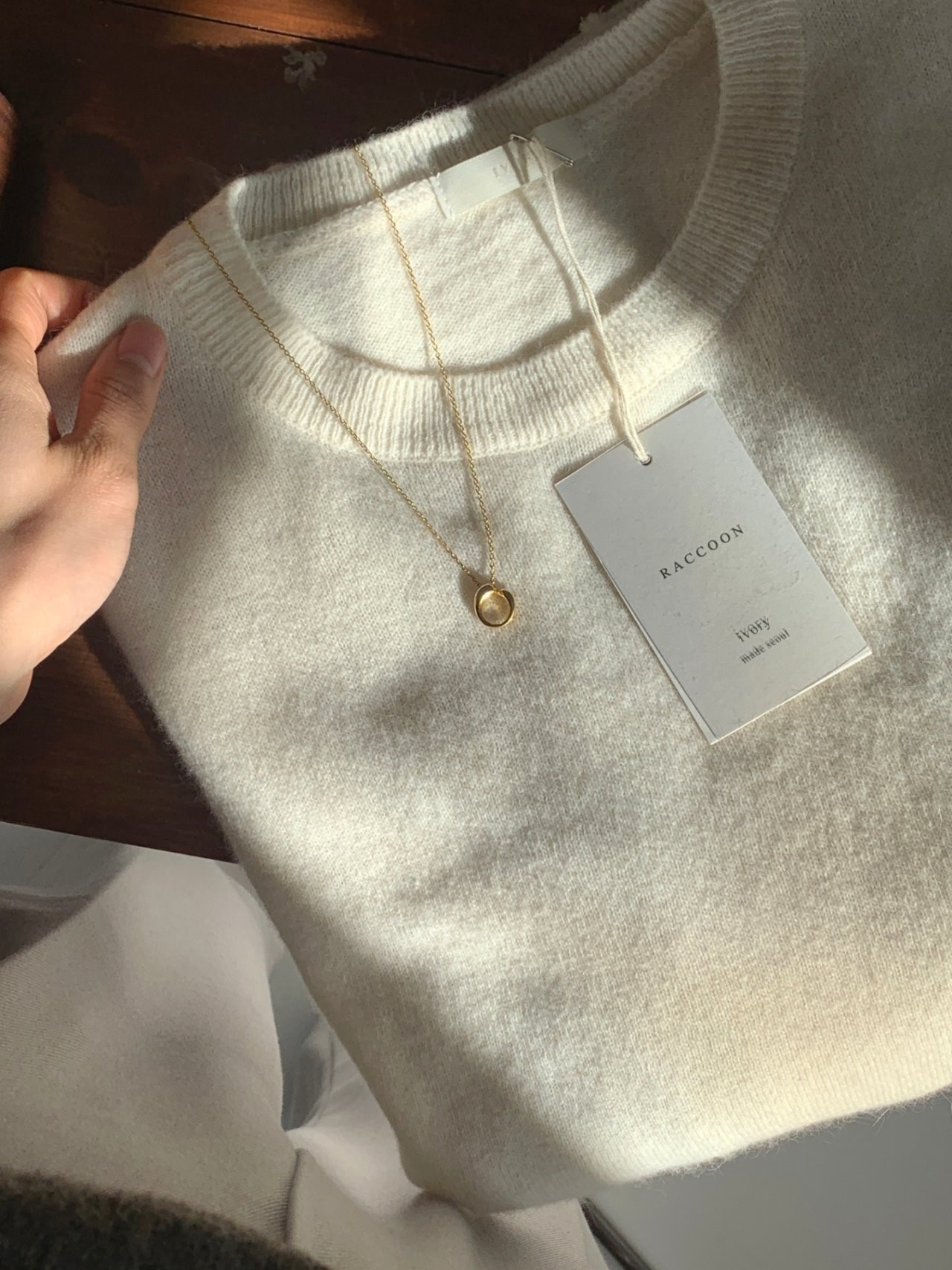品名:폭스라쿤라운드니트 ◎※☞颜色:베이지, 아이보리 ◎※☞尺寸:FREE ◎※☞材质:人造纤维 10%,울 50%,폭스 10%,浣熊毛 30% ◎※☞注意事项:只能干洗,只能手洗,不能手洗,机洗,不能使用漂白剂,不能烘干,不能熨烫,不能曲折