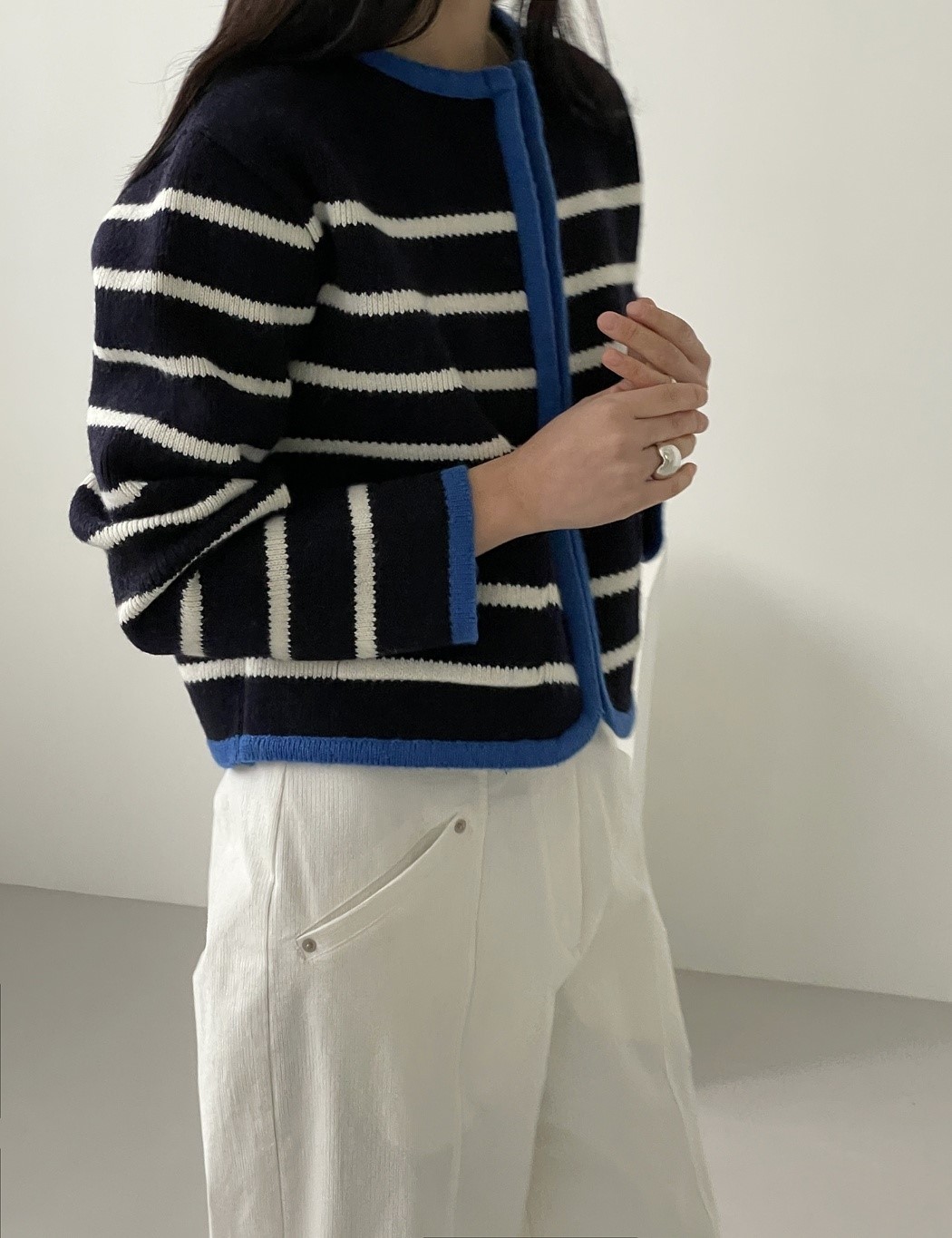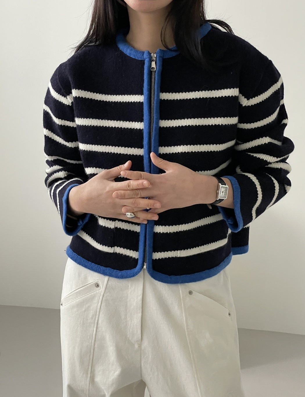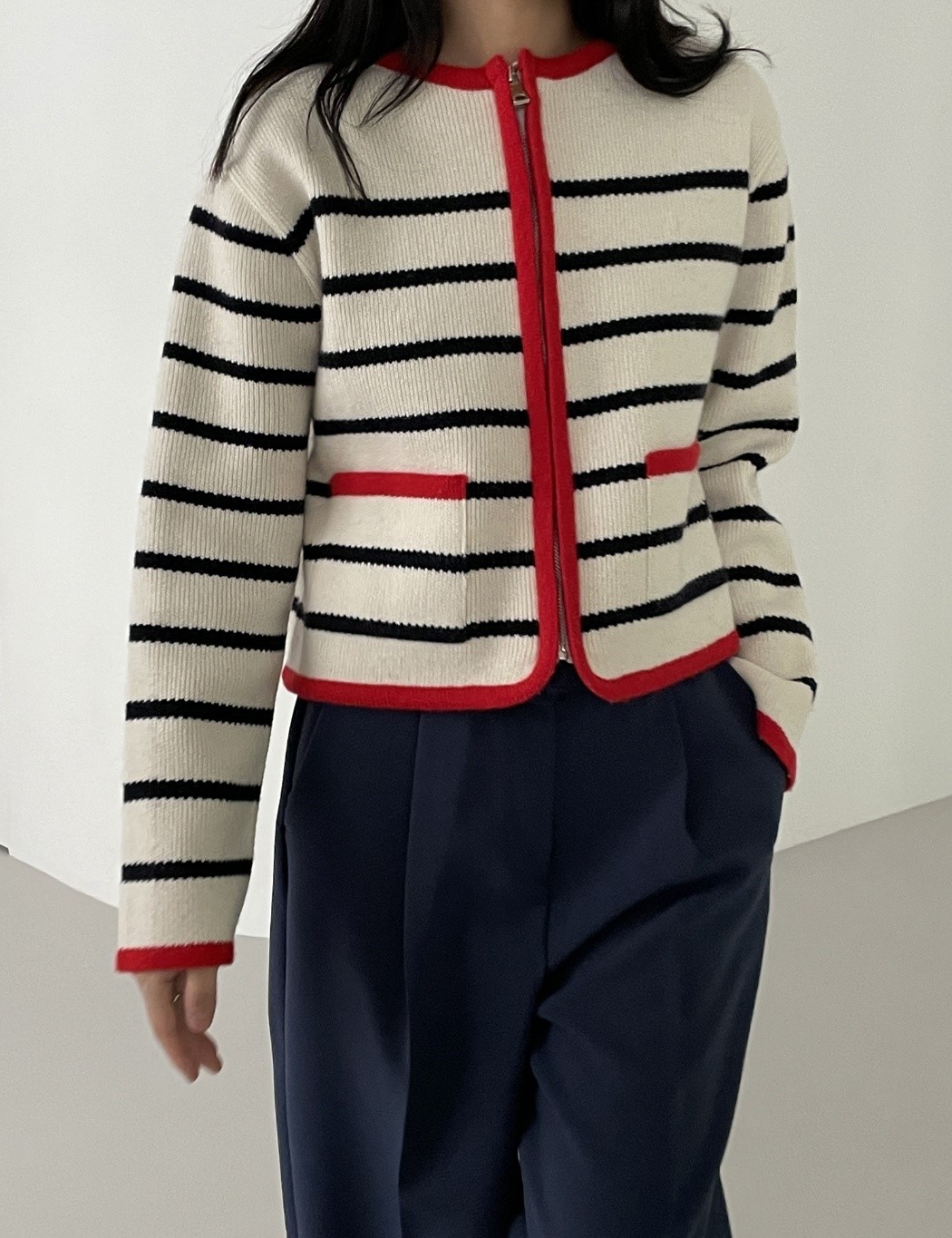 品名:단가라포켓집업 ◎※☞颜色:네이비, 아이보리 ◎※☞尺寸:FREE ◎※☞材质:腈纶 70%,울 30% 翻译