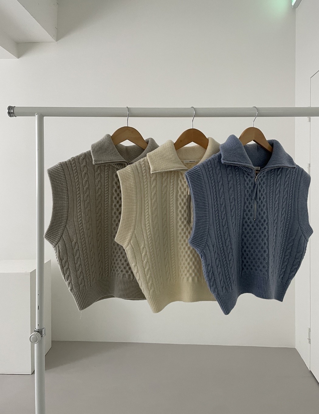 品名:집업니트vest ◎※☞颜色:그레이, 소라, 아이보리 ◎※☞尺寸:FREE ◎※☞材质:腈纶 70%,울 30% 翻译