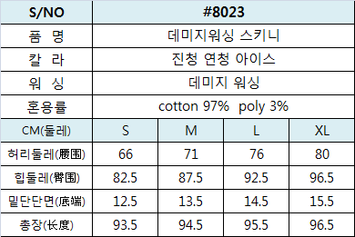 品名:봄신상 8023 허리밴딩 스판 스키니 기본 청바지 데님 팬츠 ◎※☞颜色:아이스, 연청, 진청 ◎※☞尺寸:L, M, S, XL ◎※☞材质:纯棉 97%,스판 3% ◎※☞注意事项:只能干洗,只能手洗,不能手洗,机洗,不能使用漂白剂,不能烘干,不能熨烫,不能曲折