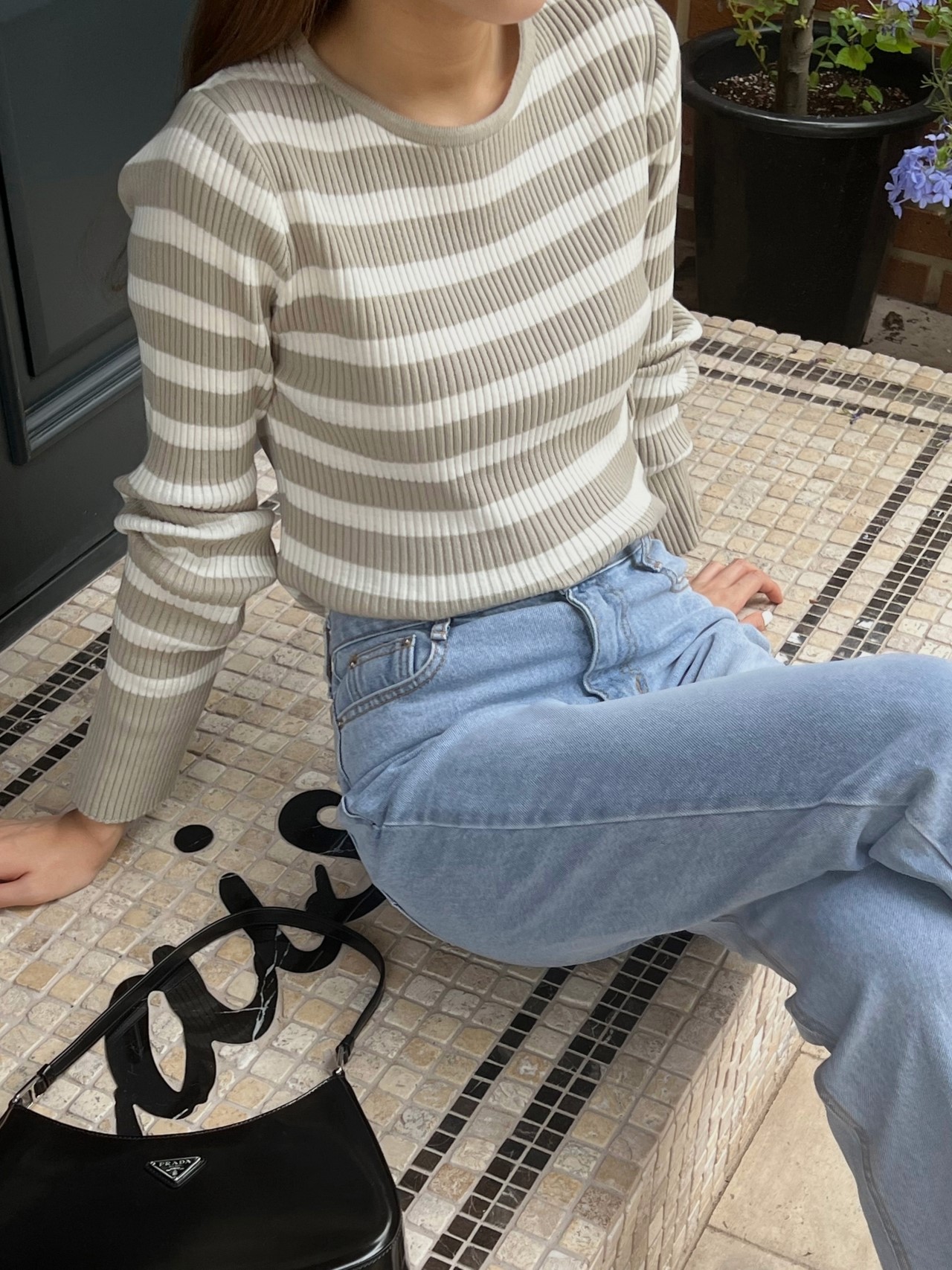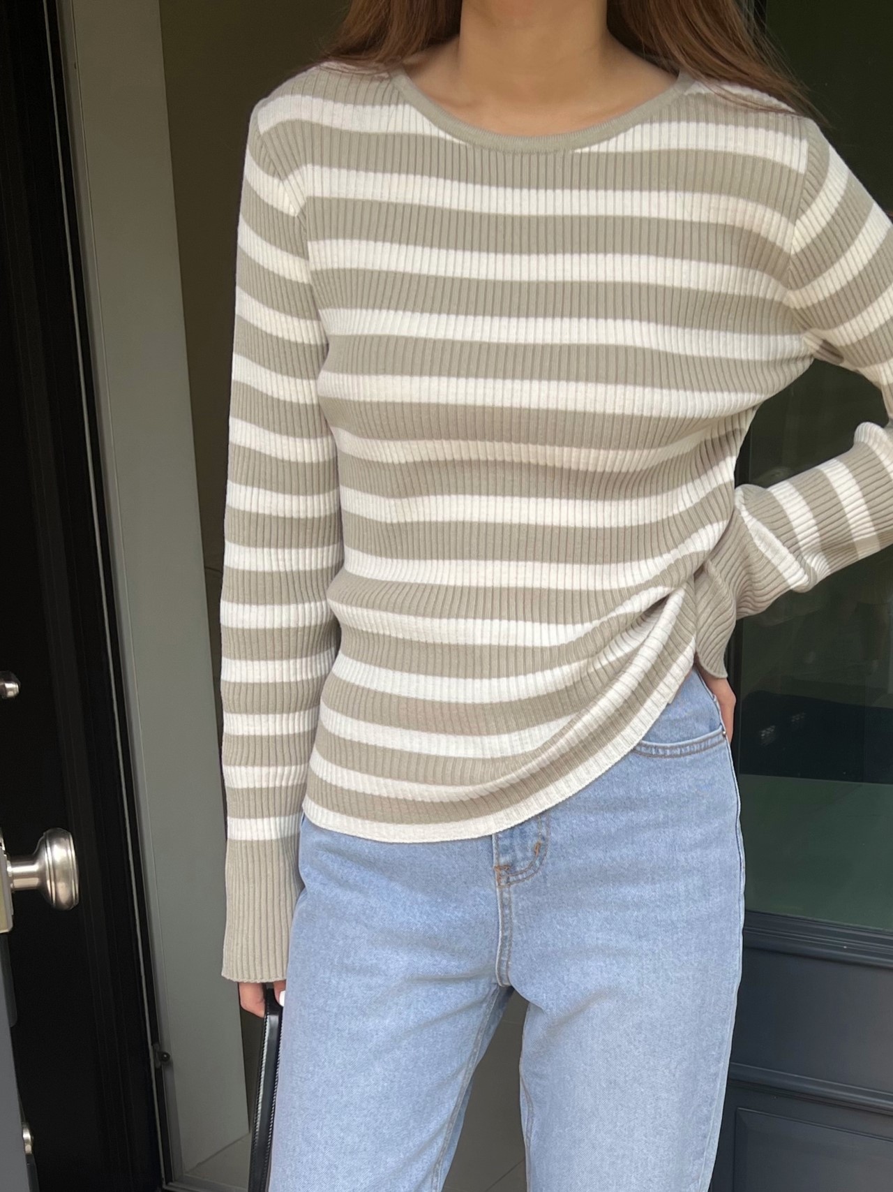 品名:时尚条纹圆领针织上衣 ◎※☞颜色:모카, 블랙, 연카키 ◎※☞尺寸:FREE ◎※☞材质:腈纶 72%,聚酯 28% 翻译
