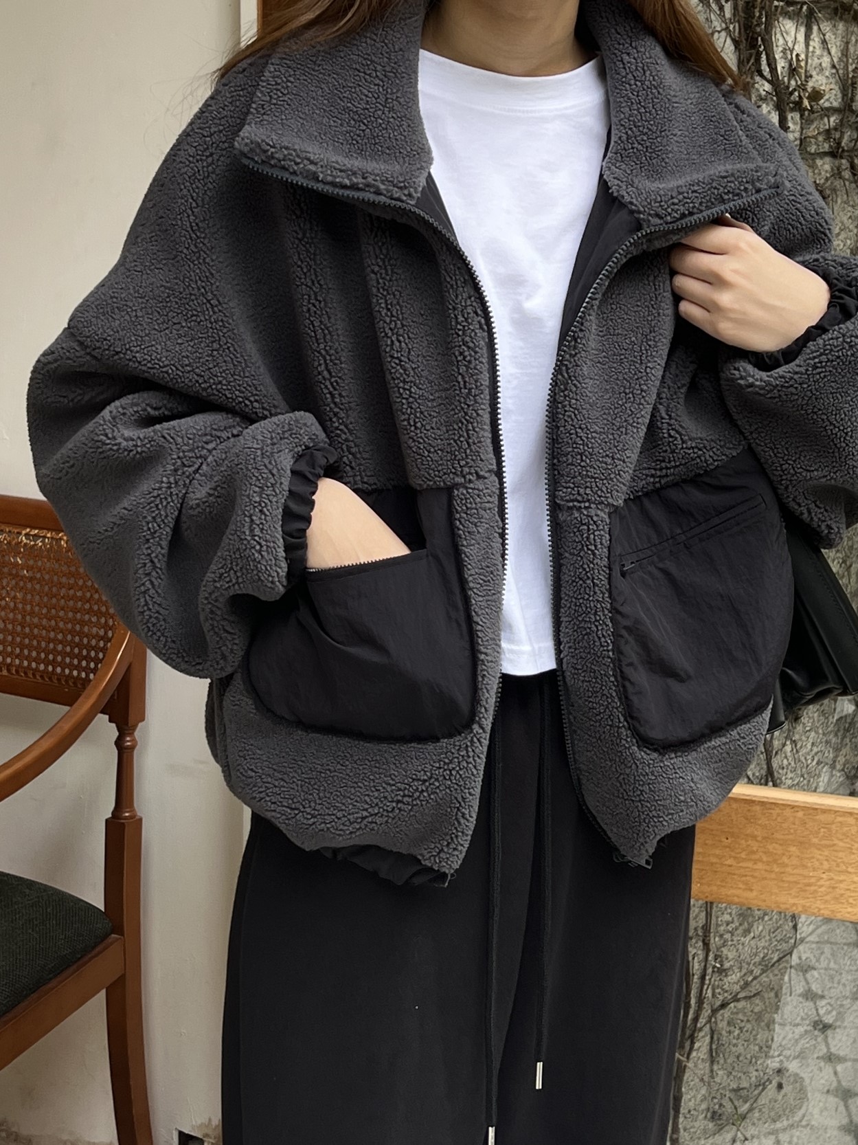 品名:O2) 雪绒棉宽松夹克外套 ◎※☞颜色:차콜, 크림 ◎※☞尺寸:FREE ◎※☞材质:聚酯 100% ◎※☞注意事项:只能干洗,只能手洗,不能手洗,机洗,不能使用漂白剂,不能烘干,不能熨烫,不能曲折 翻译