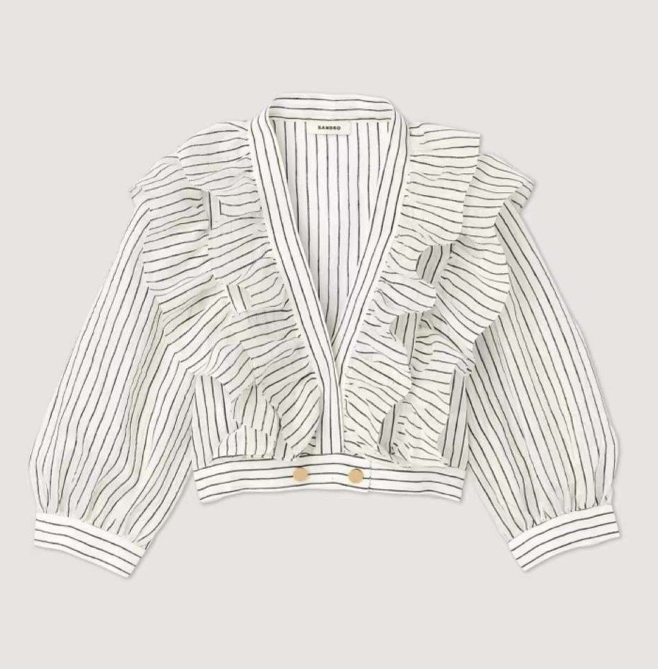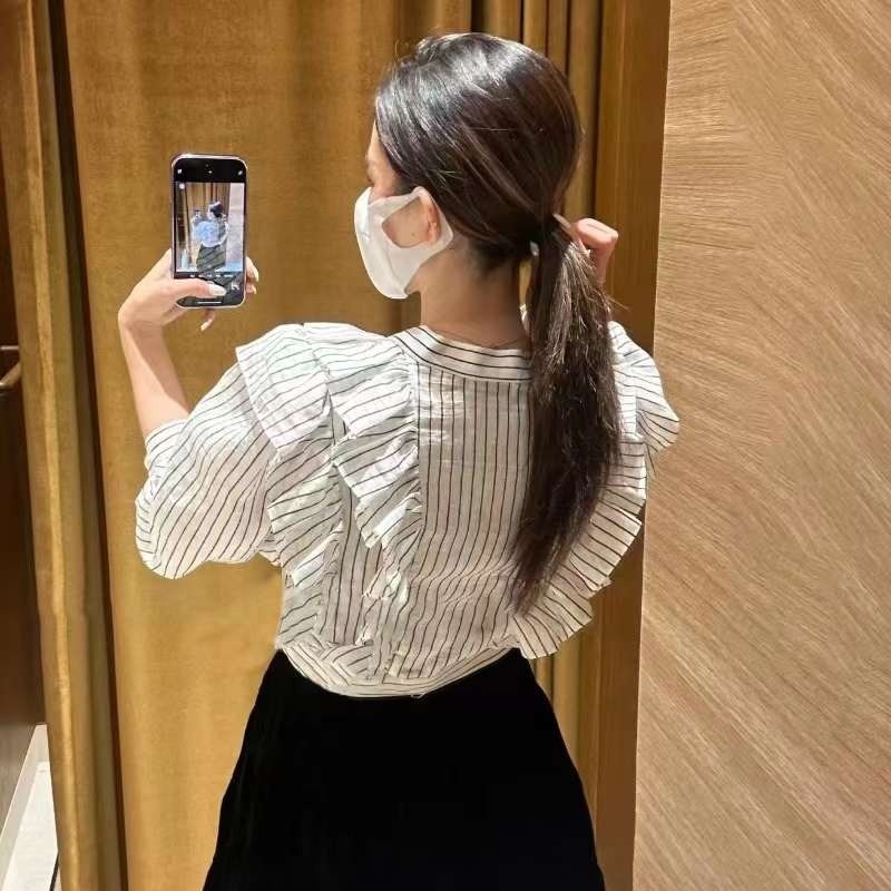 品名:명품 줄가라러플 숏 블라우스 ◎※☞颜色:화이트 ◎※☞尺寸:55, 66, 77 ◎※☞材质:纯棉 50%,聚酯 50% 翻译