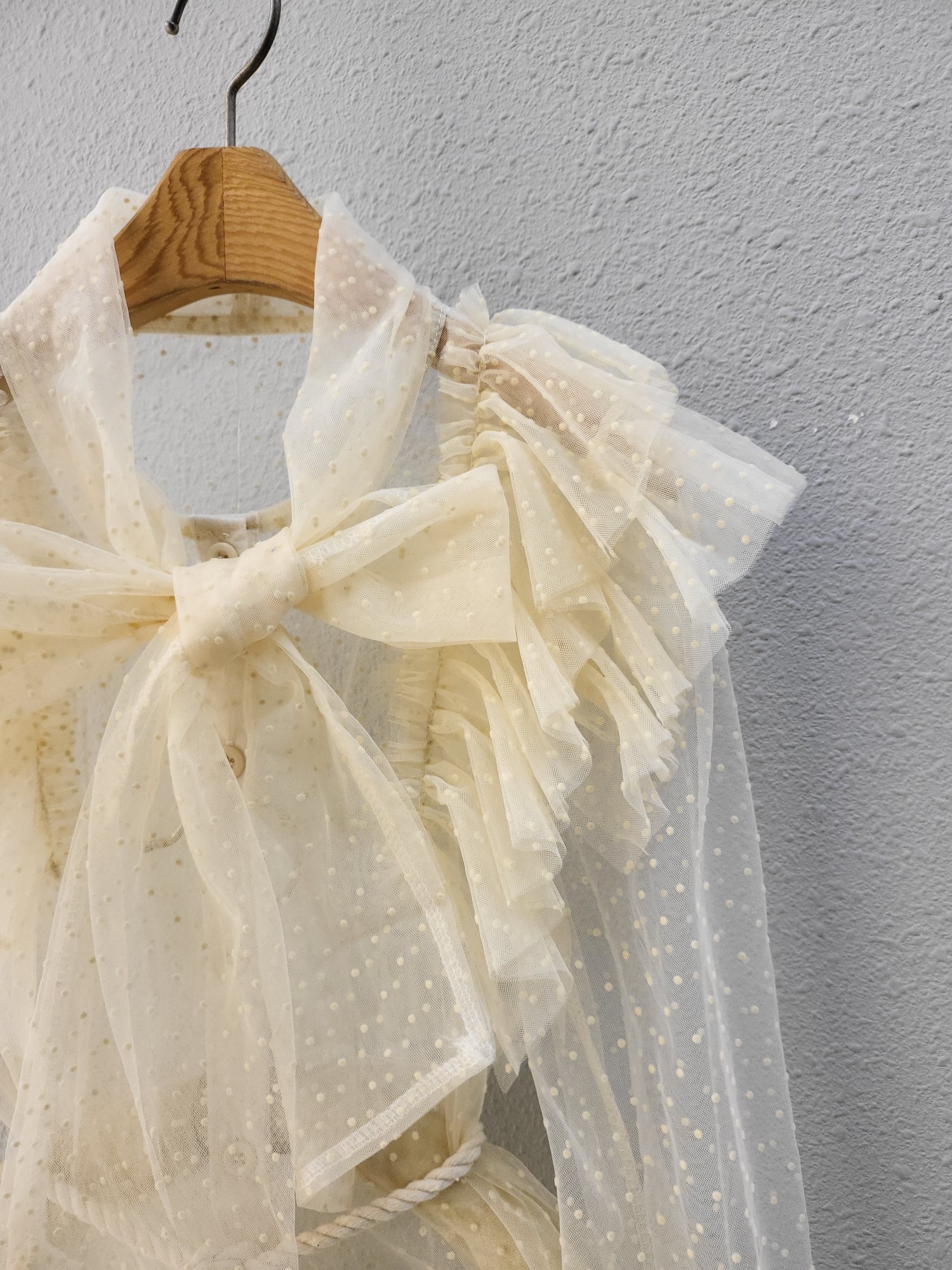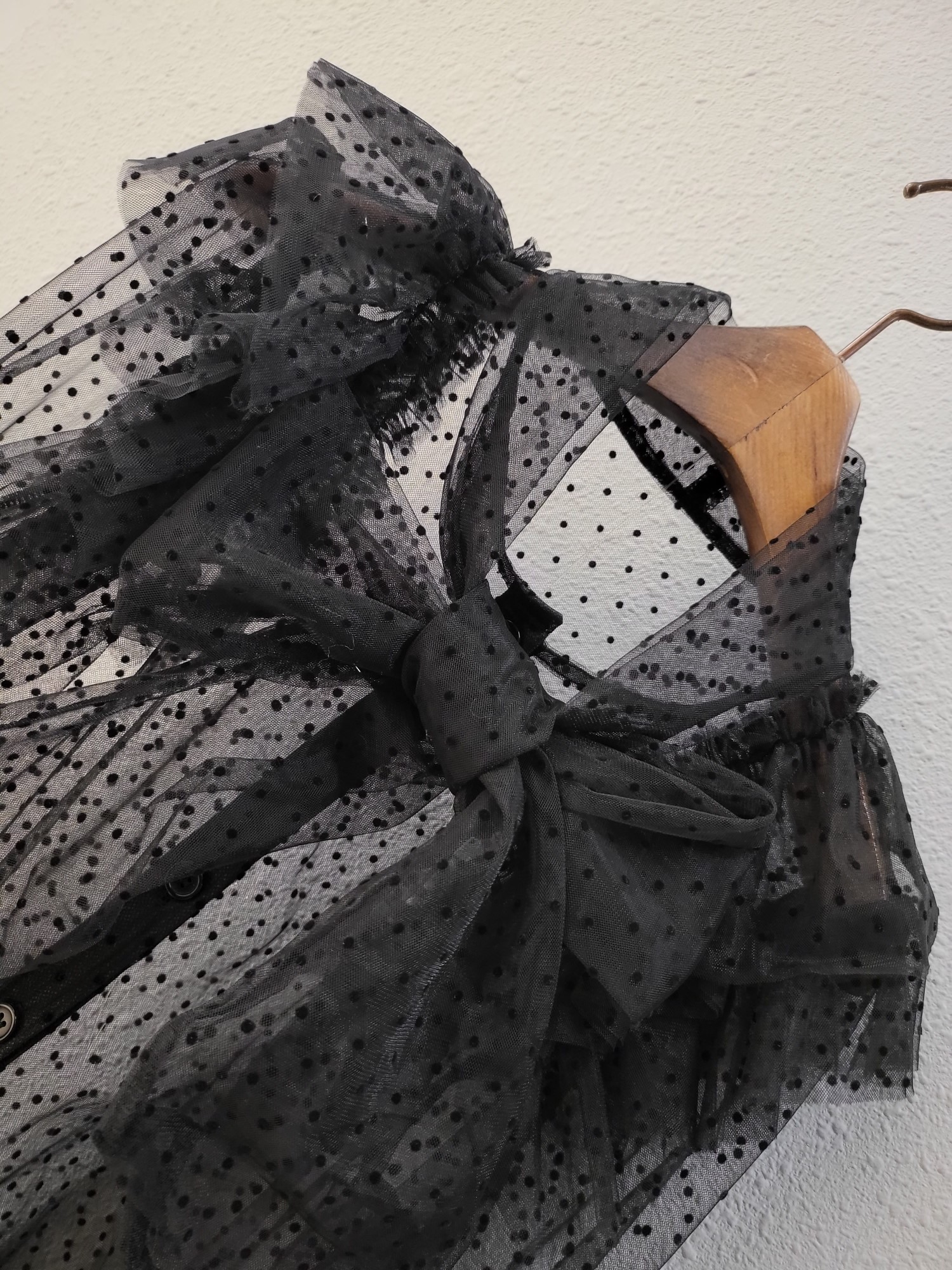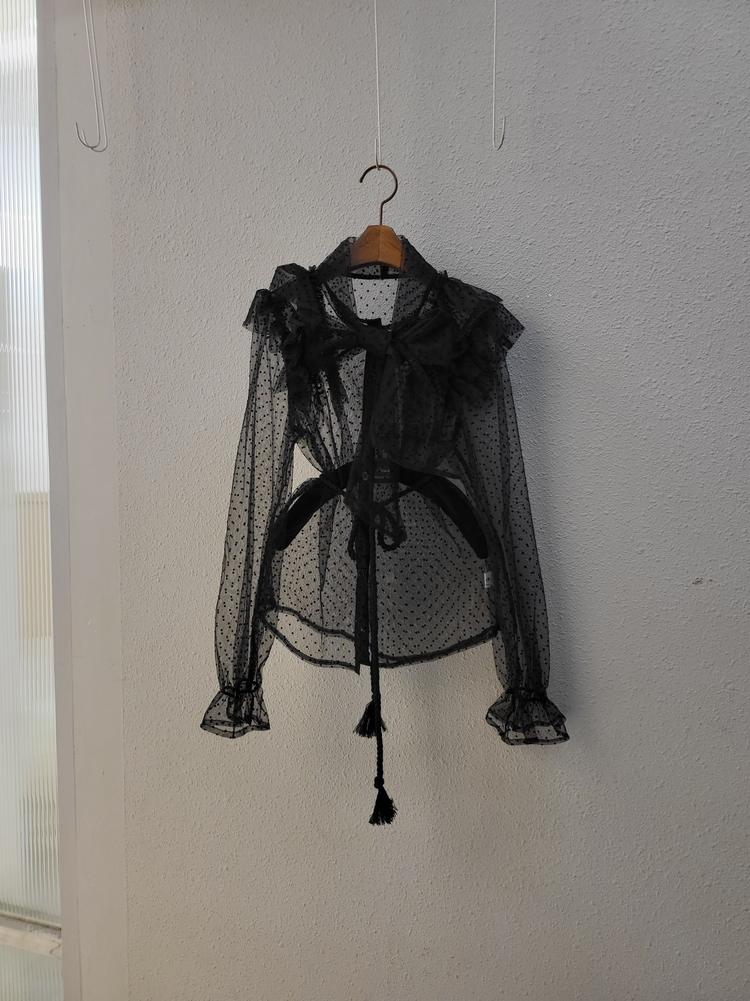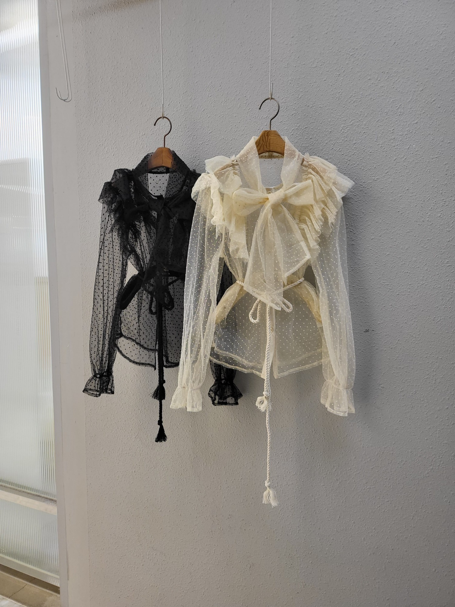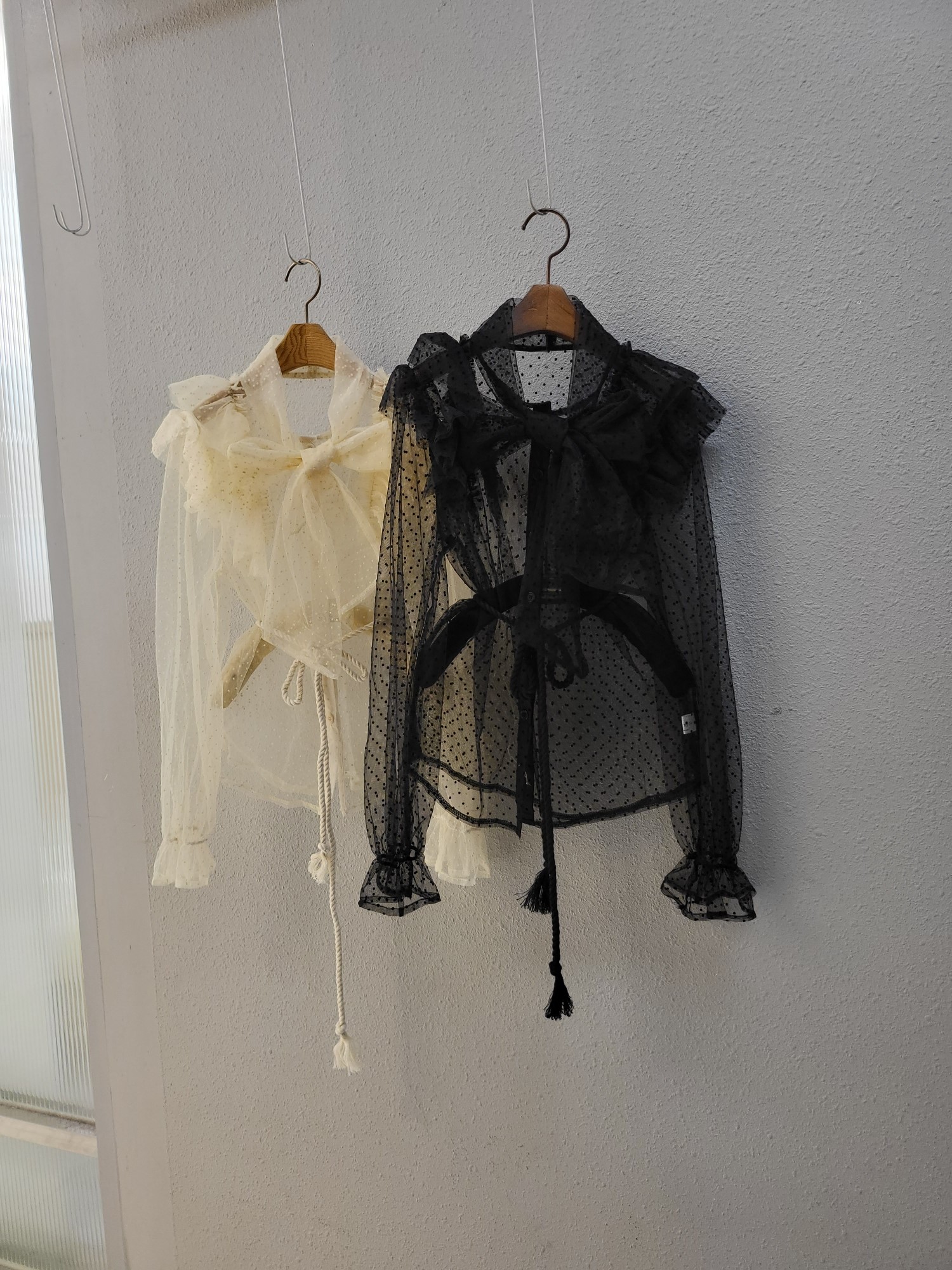 品名:로맨틱 도트 프릴 벨트 블라우스 ◎※☞颜色:블랙, 아이보리 ◎※☞尺寸:FREE ◎※☞材质:聚酯 100% 翻译