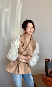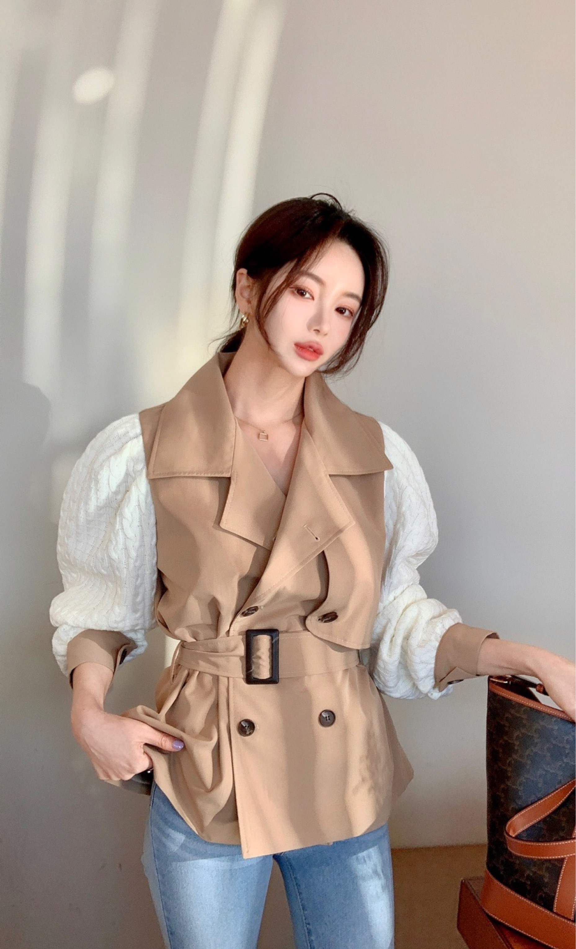 포인트✨我家这个独特的新款在风衣面料上拼接了麻花针织袖。