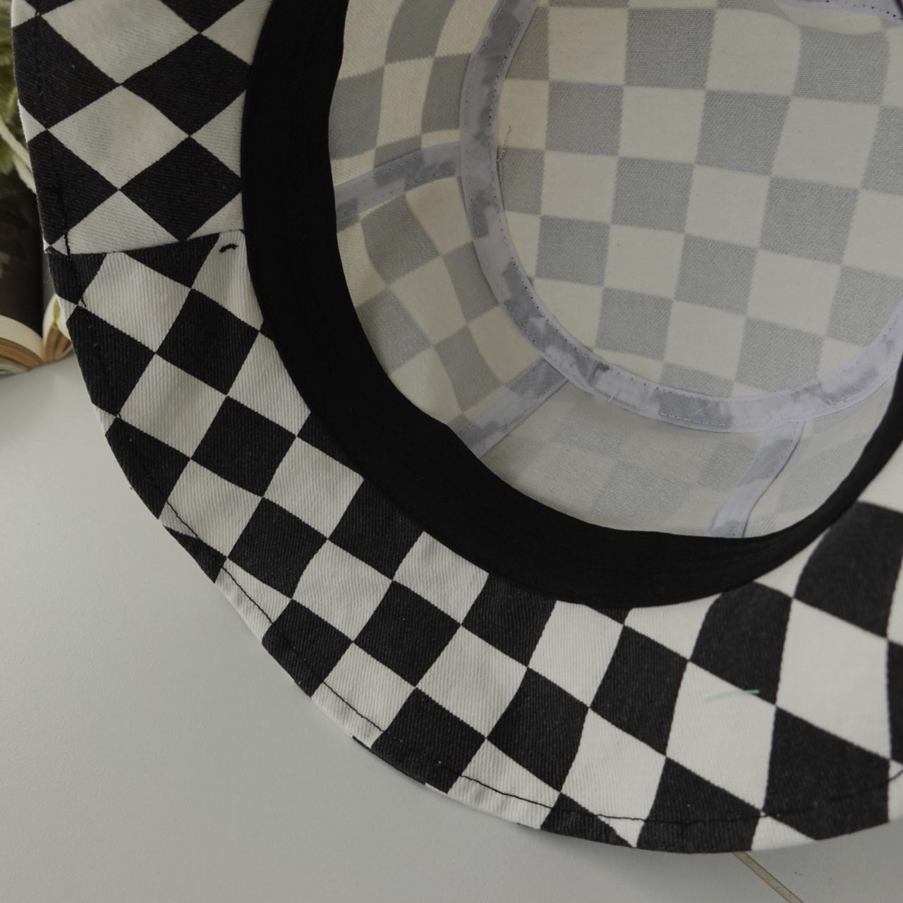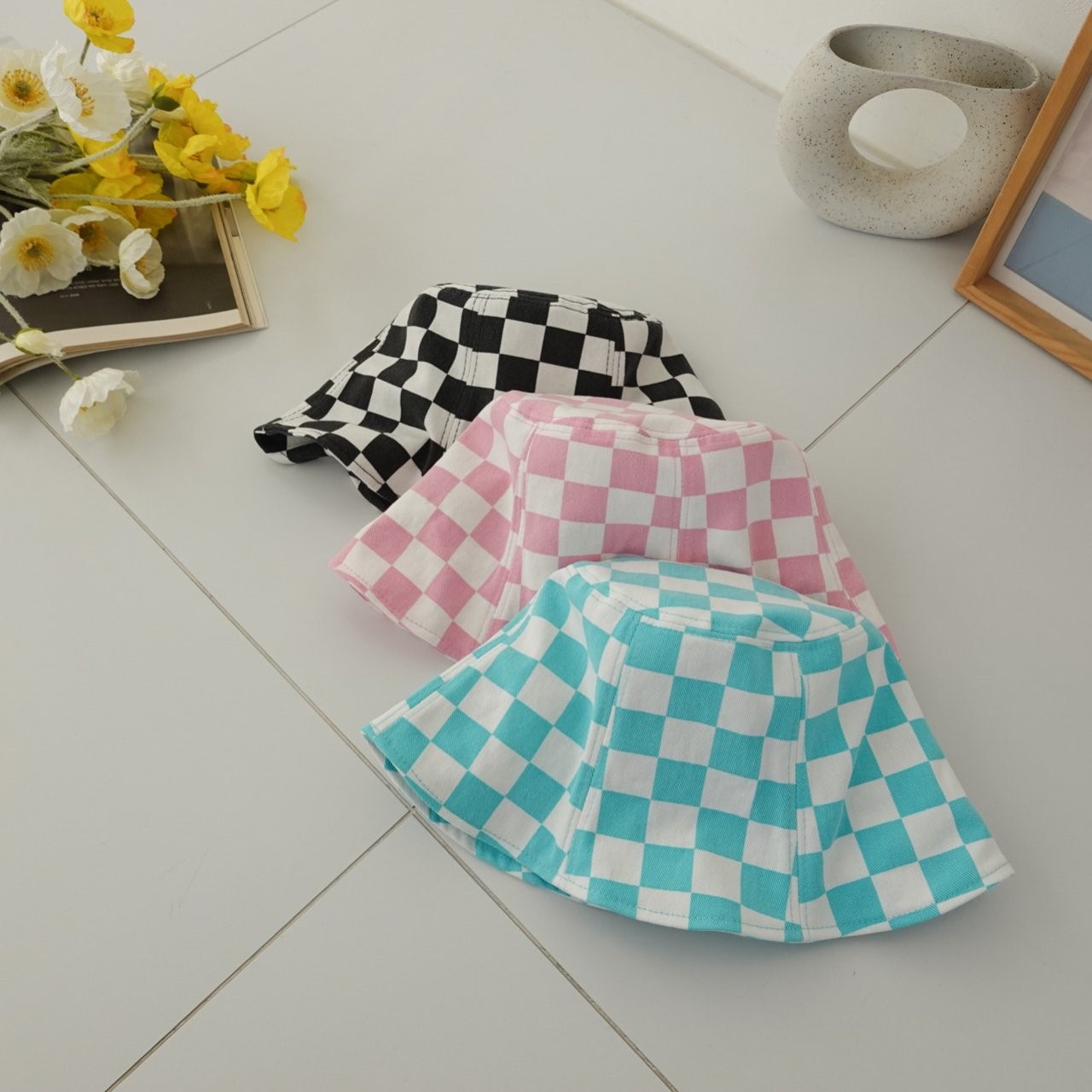 品名:신상 BH1099 체커보드 나팔 버킷햇 ◎※☞颜色:블랙, 블루, 핑크 ◎※☞尺寸:F ◎※☞材质:纯棉 100% 翻译