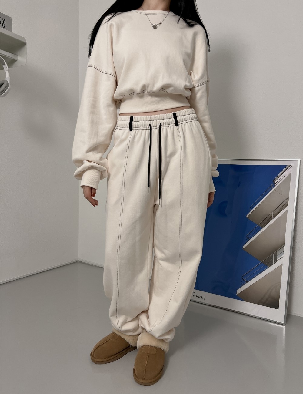 品名:포인트조거PT ◎※☞颜色:블랙, 아이보리 ◎※☞尺寸:FREE ◎※☞材质:纯棉 100% 翻译