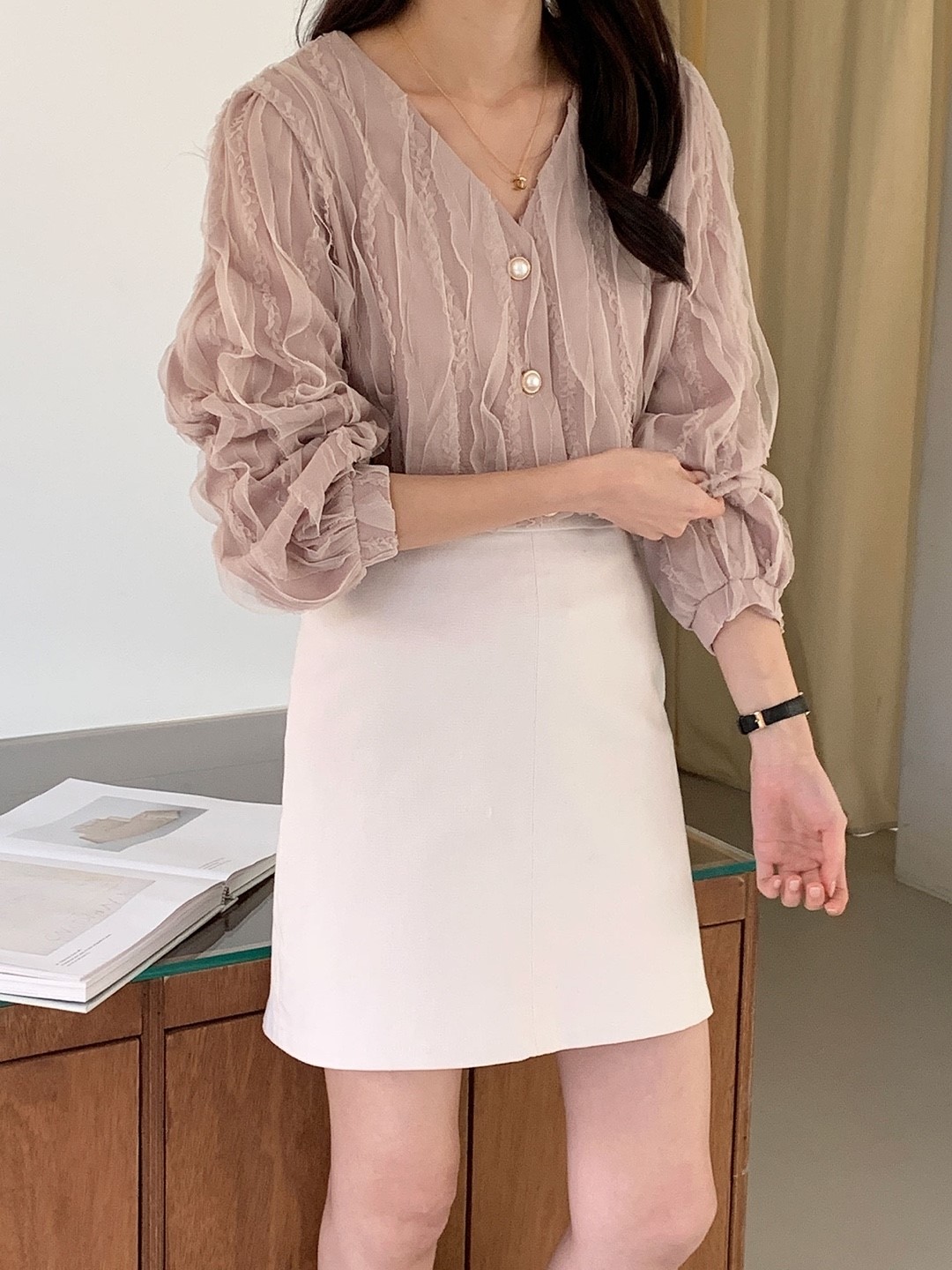 品名:프라하 블라우스 ◎※☞颜色:베이지, 아이보리 ◎※☞尺寸:FREE ◎※☞材质:尼龙 98%,弹力 2% 翻译