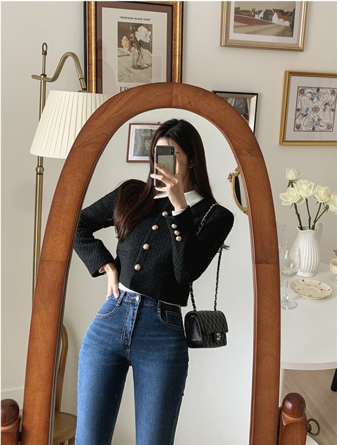 品名:미유 배색카라 크롭 트위드자켓 ◎※☞颜色:검정, 아이보리 ◎※☞尺寸:FREE ◎※☞材质:聚酯 100% ◎※☞注意事项:只能干洗,只能手洗,不能手洗,机洗,不能使用漂白剂,不能烘干,不能熨烫,不能曲折