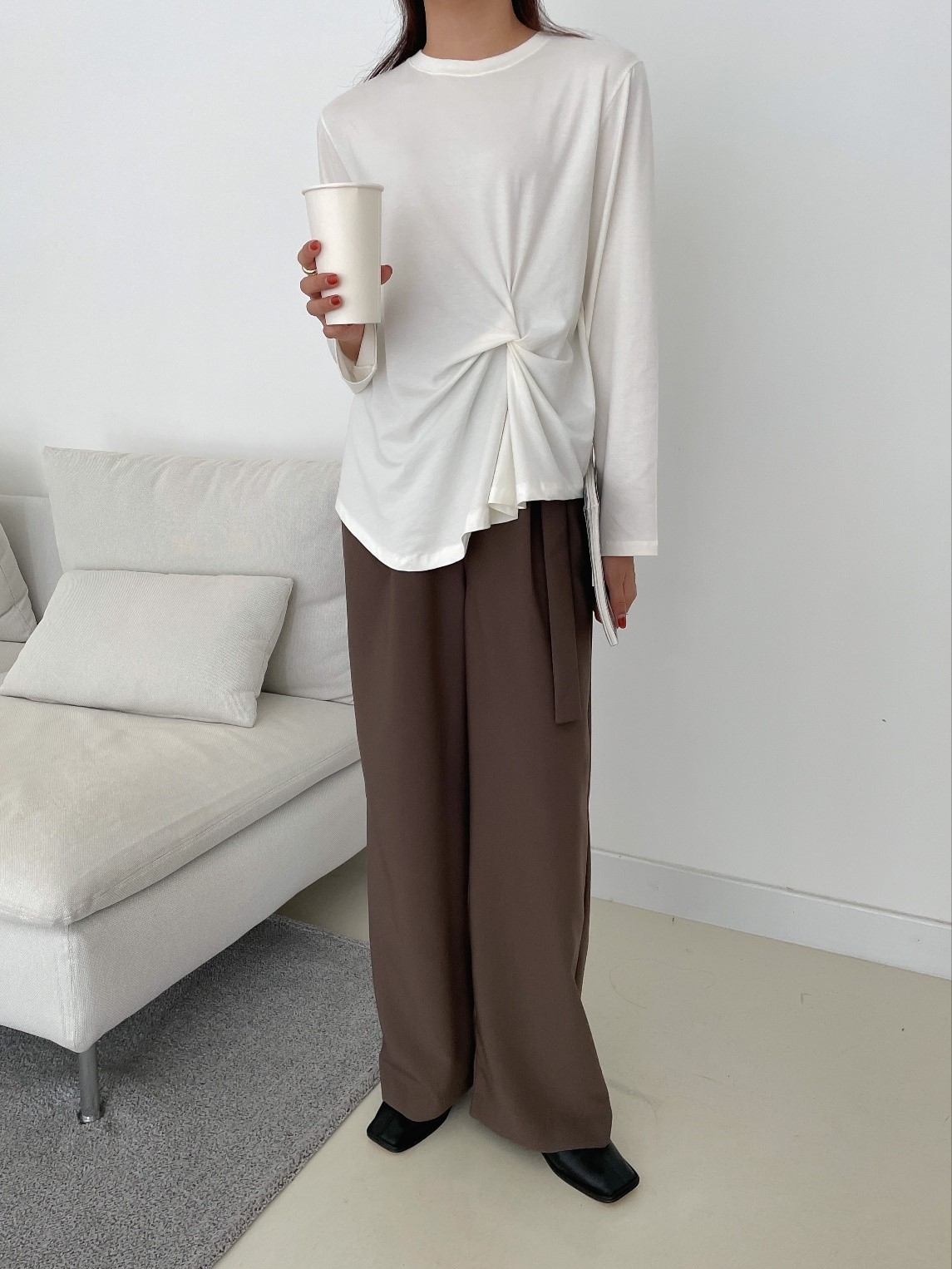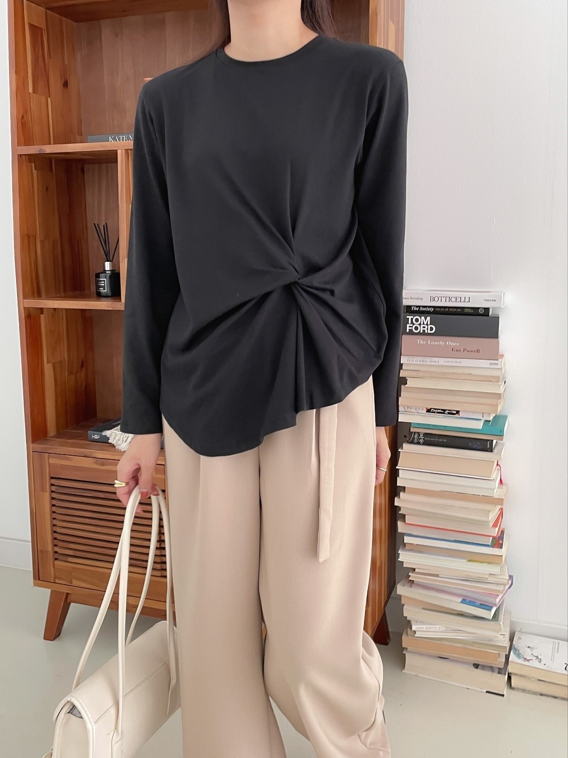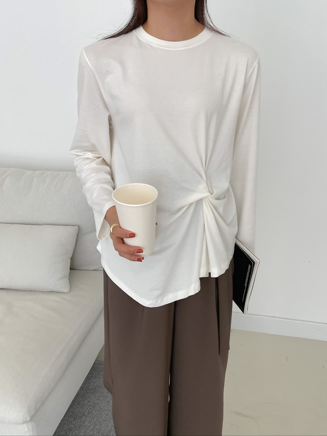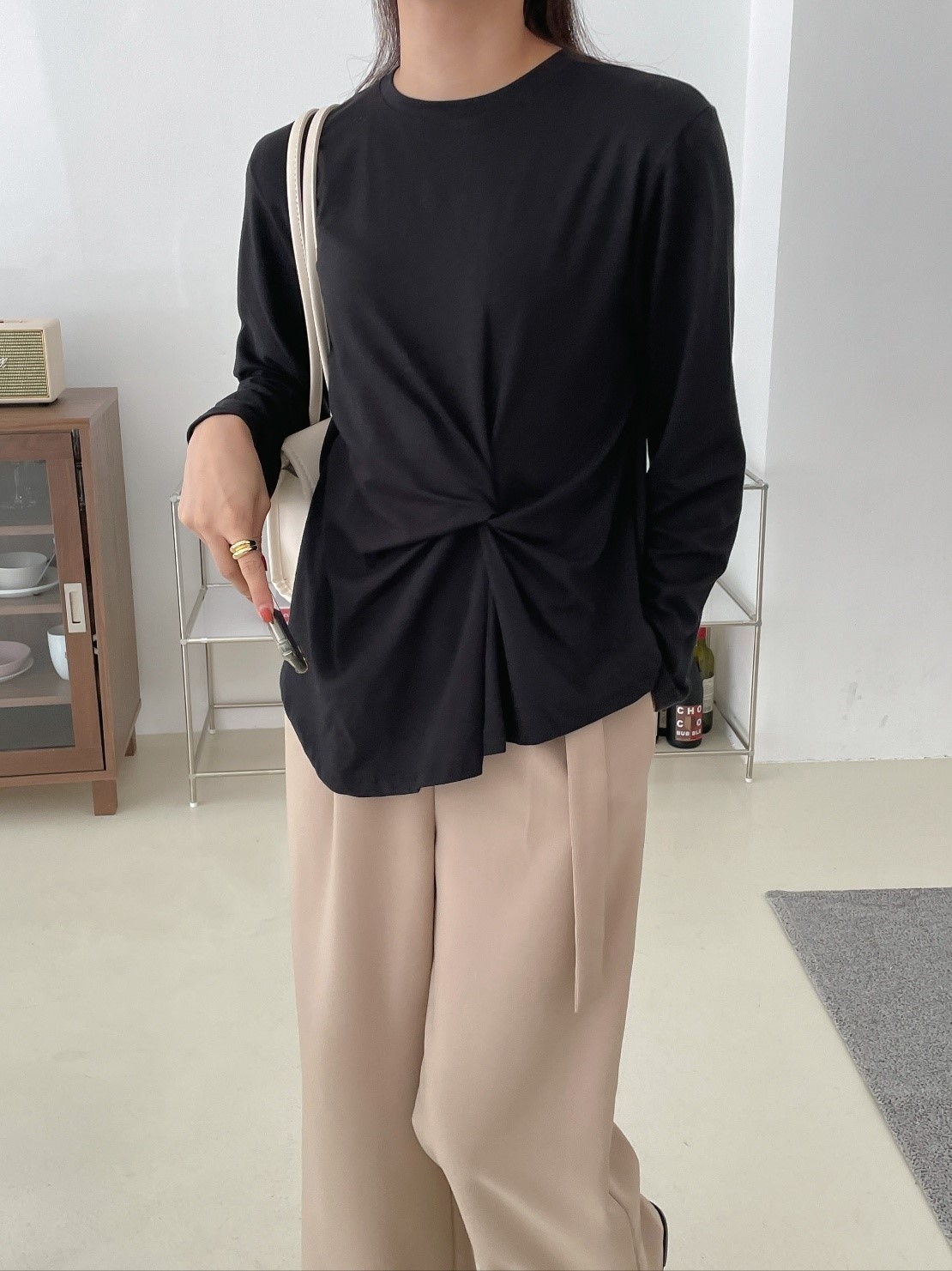 品名:허니꼬임T ◎※☞颜色:밤색, 블랙, 아이보리, 크림, 핑크 ◎※☞尺寸:FREE ◎※☞材质:스판 4%,纯棉 58%,모달 38% 翻译