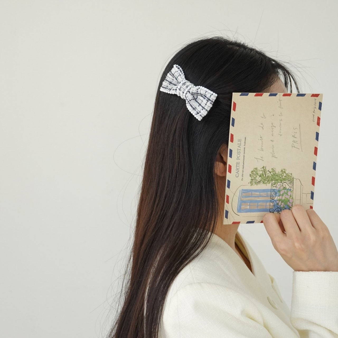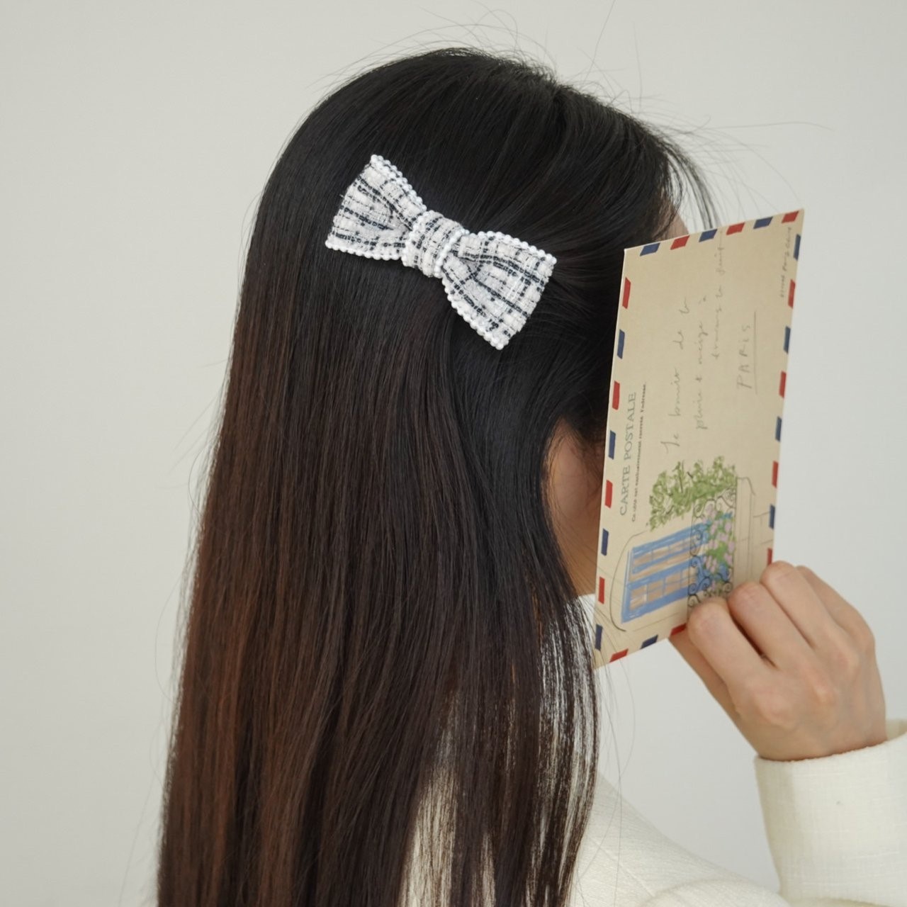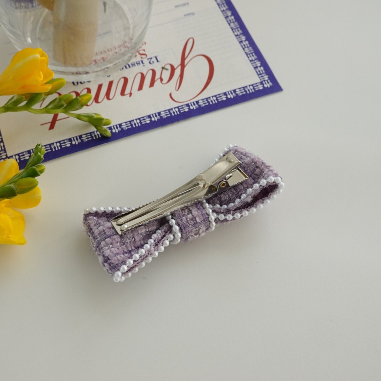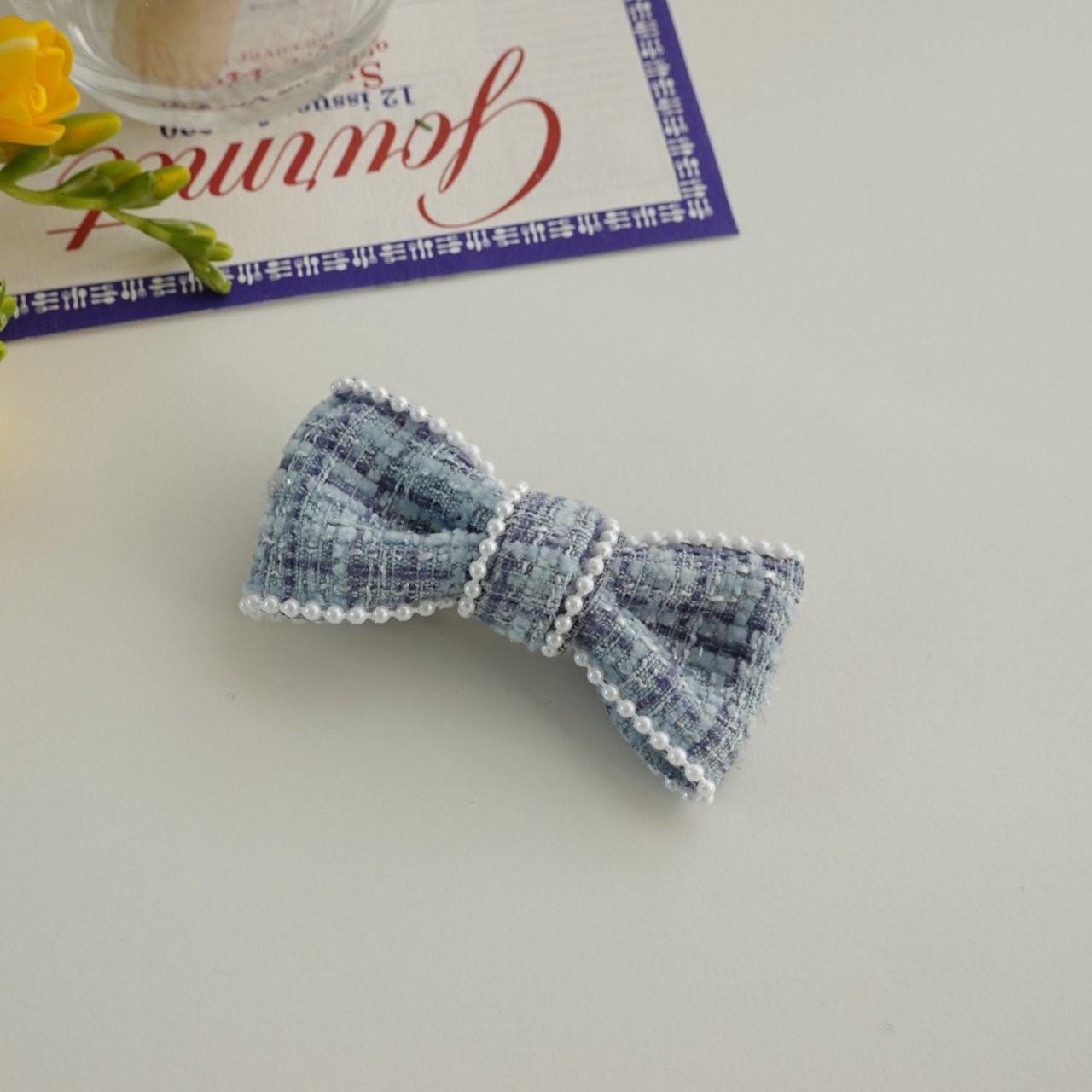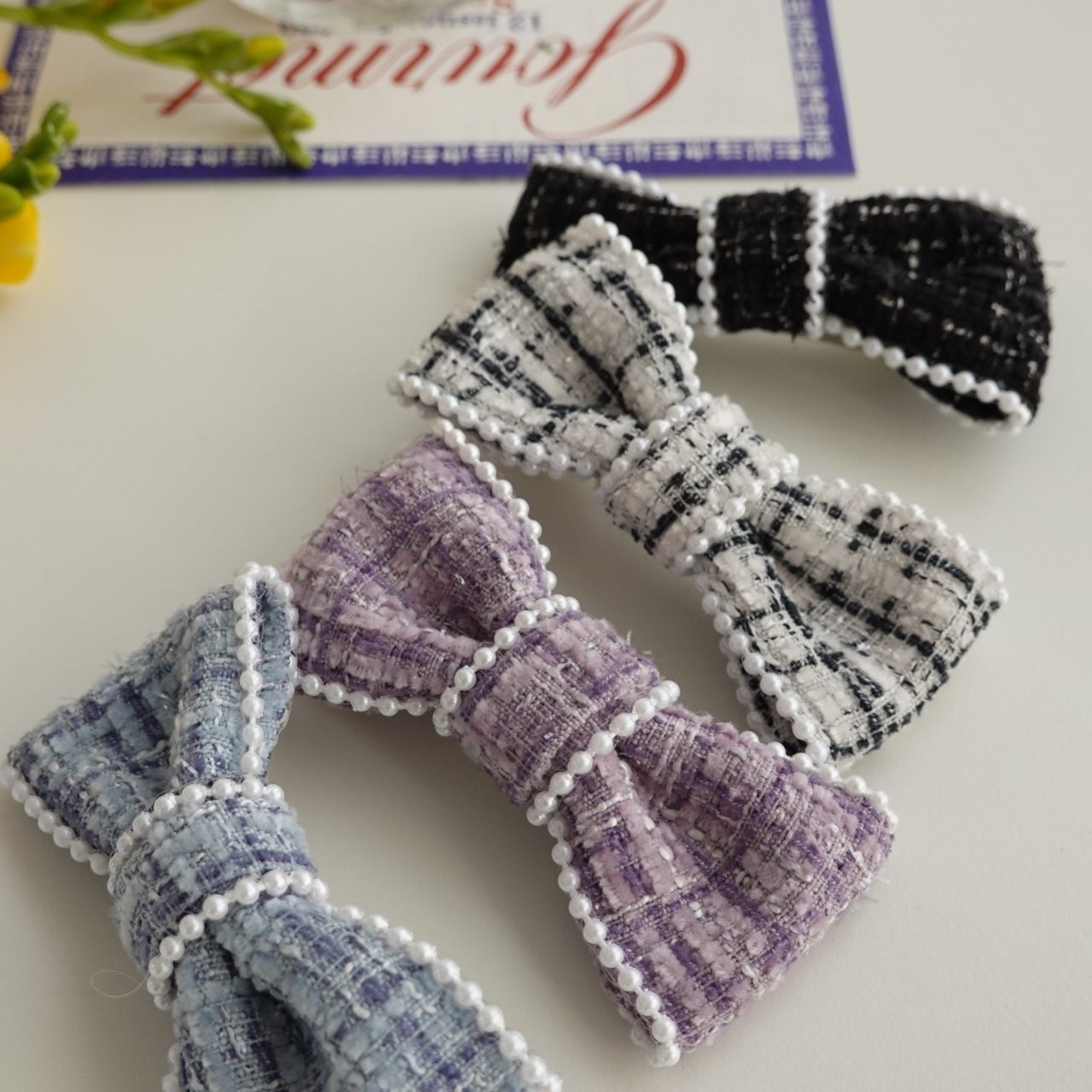 品名:H3007 트위드 리본 헤어핀 ◎※☞颜色:블랙, 블루, 퍼플, 화이트 ◎※☞尺寸:F ◎※☞材质:스틸 0% 翻译