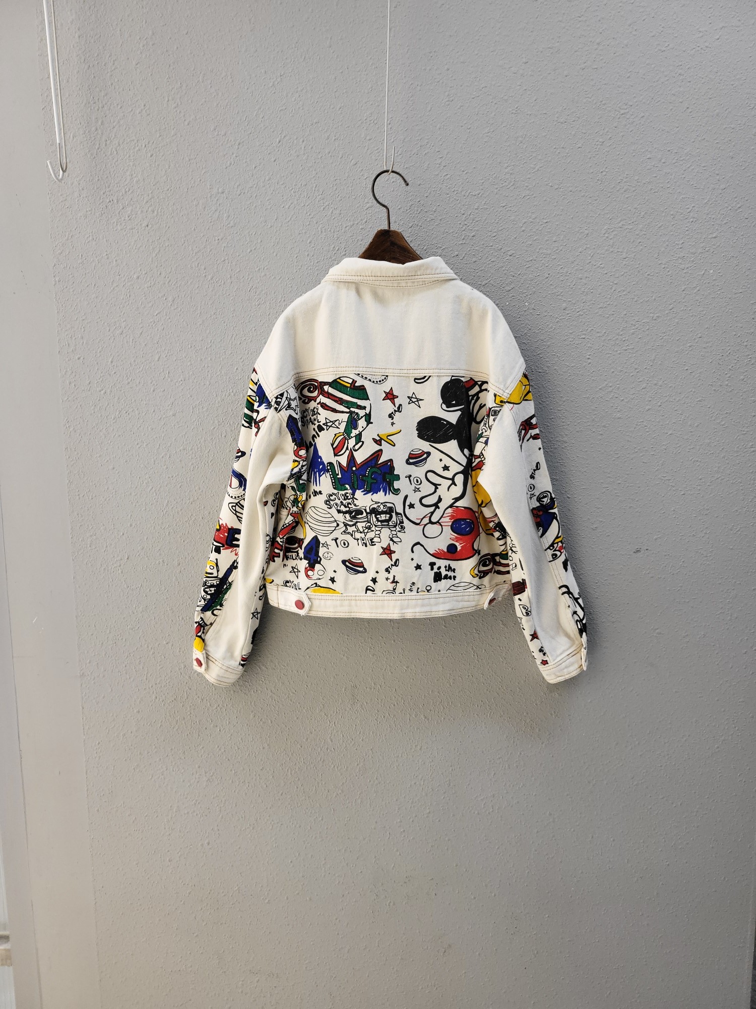 品名:유니크 프린트 언발 커팅 데님 자켓 ◎※☞颜色:화이트 ◎※☞尺寸:FREE ◎※☞材质:纯棉 100% 翻译