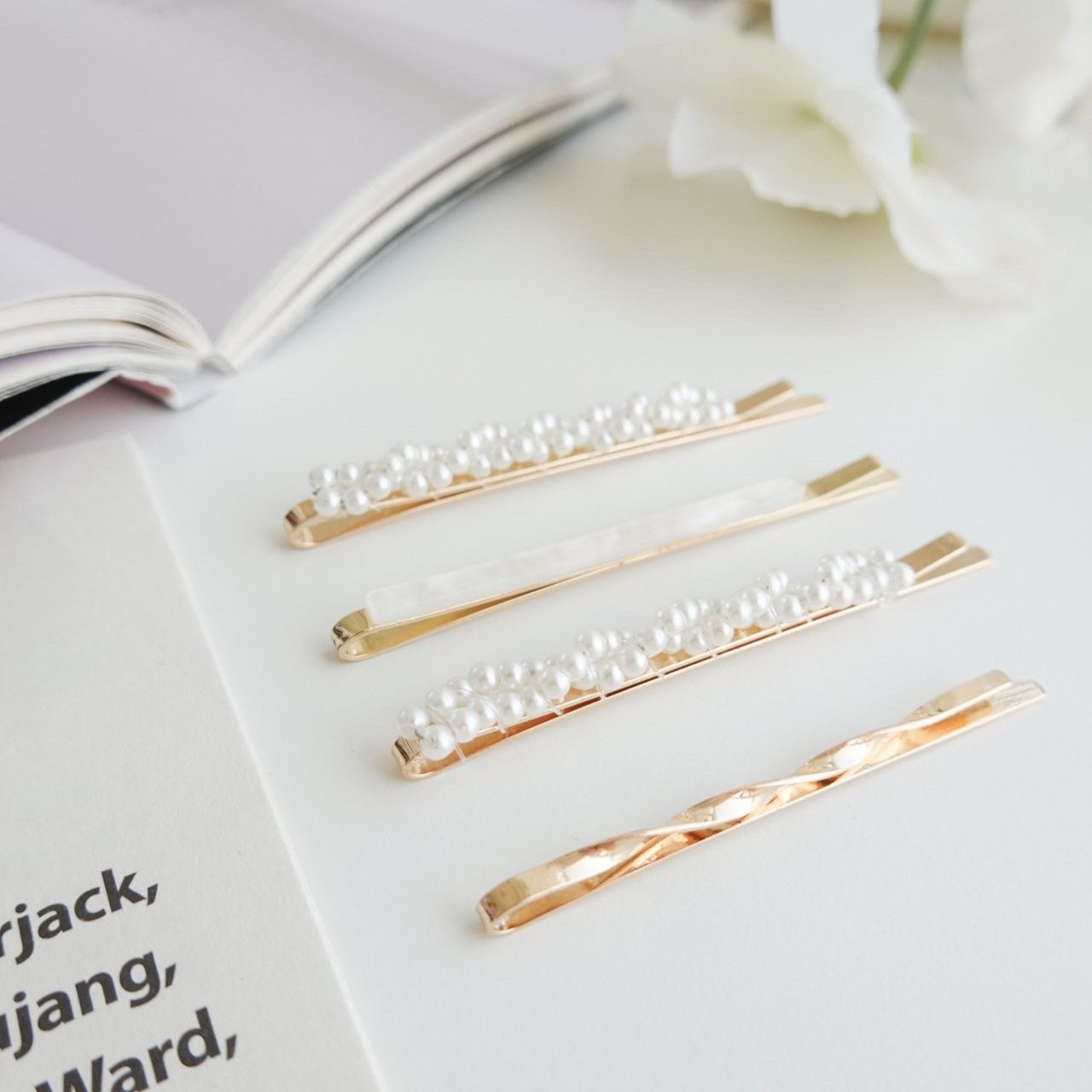 品名:H1509 진주 헤어핀 세트 ◎※☞颜色:골드 ◎※☞尺寸:F ◎※☞材质:스틸 0% 翻译