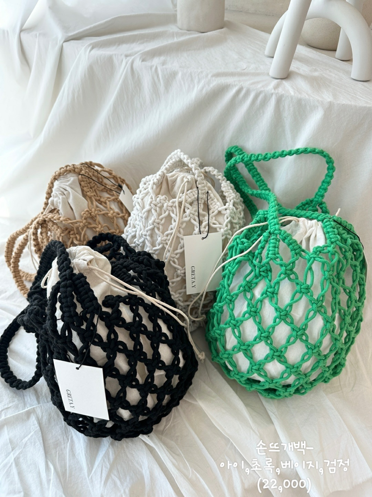 品名:손뜨개 가방 ◎※☞颜色:베이지, 블랙, 초록, 화이트 ◎※☞尺寸:FREE ◎※☞材质:纯棉 100% 翻译